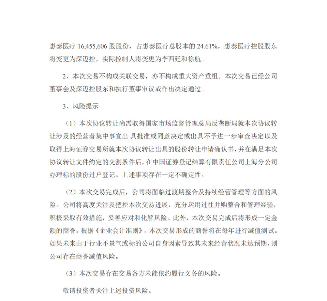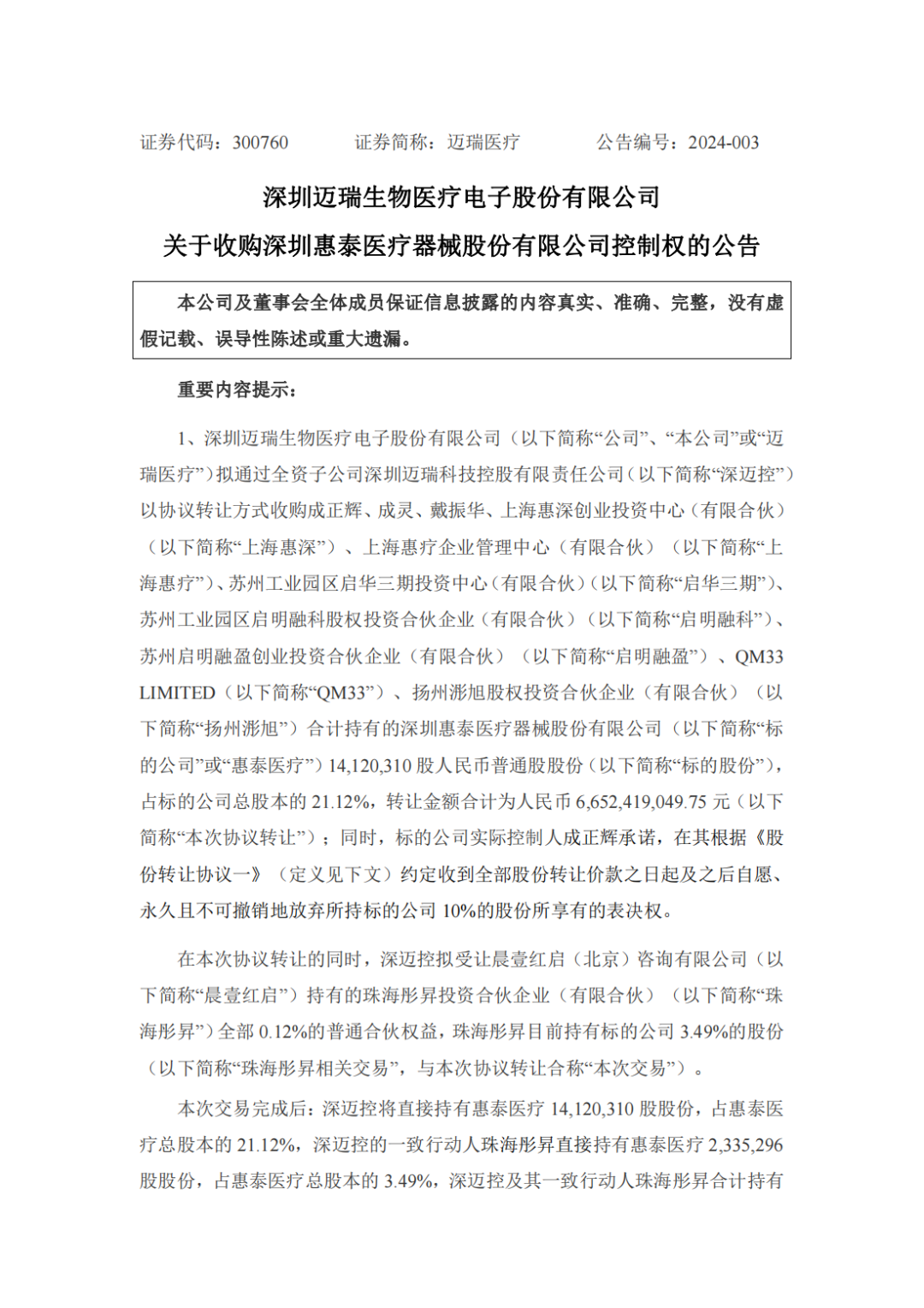 摘要: 公司拟通过全资子公司深迈控以协议转让方式收购惠泰医疗21.12%股份,转让金额合计为约66.52亿元