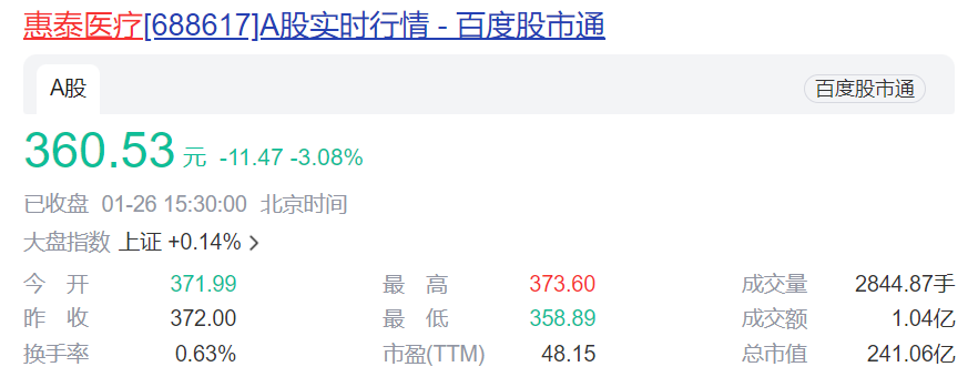 深圳惠泰医疗器械股份有限公司是一家专注于心脏电生理和介入医疗器械的研发、生产和销售的高新技术企业,已形成了以完整冠脉通路和心脏电生理医疗器械为主导,外周血管介入医疗器械为重点发展方向的业务布局。于2021年1月7日在上海证券交易所科创板上市,证券简称“惠泰医疗”,证券代码“688617”,当前市值241亿元。