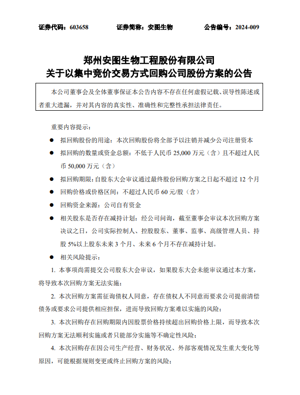 1月29日晚间,安图生物公告称,拟以2.5亿元-5亿元回购股份,全部予以注销并减少公司注册资本,回购价格不超过60元/股。