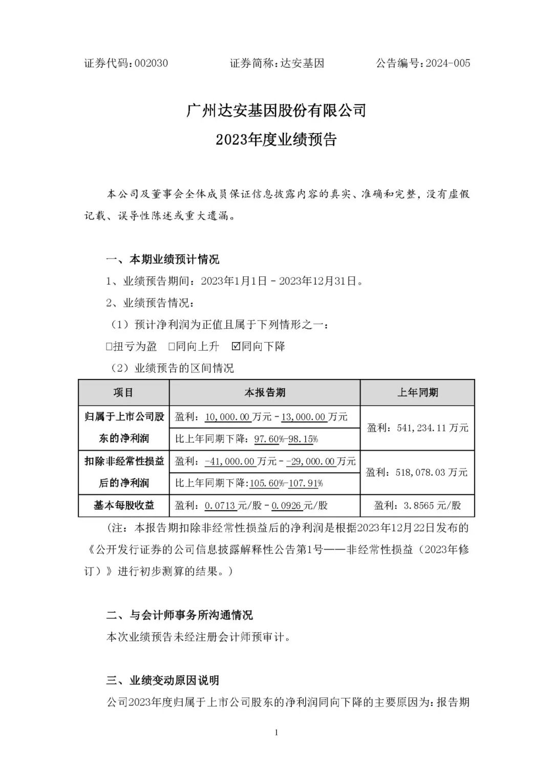 达安基因1月31日发布业绩预告,预计2023年归属于上市公司股东的净利润1亿元~1.3亿元,同比下降97.6%~98.15%;基本每股收益0.0713元~0.0926元。公司2023年度归属于上市公司股东的净利润同向下降的主要原因为:报告期内,市场需求减少,公司营业收入减少,归属于上市公司股东的净利润同向下降。报告期内,非经常性损益主要为其他非流动金融资产公允价值变动损益。 2023年1至6月份,达安基因的营业收入构成为:生物制品业占比96.84%,金融服务占比3.16%。 达安基因的董事长是薛哲强,男,35岁,学历背景为硕士;总经理是黄珞,女,43岁,学历背景为硕士。 |
