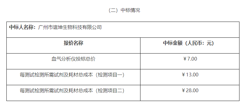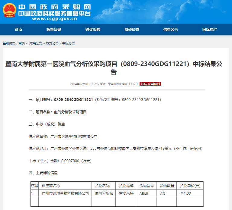 大三甲医院暨南大学附属第一医院采购7套血气分析设备,中标产品为雷度米特血气分析仪ABL9,中标总价格为7块钱,1块钱一套。