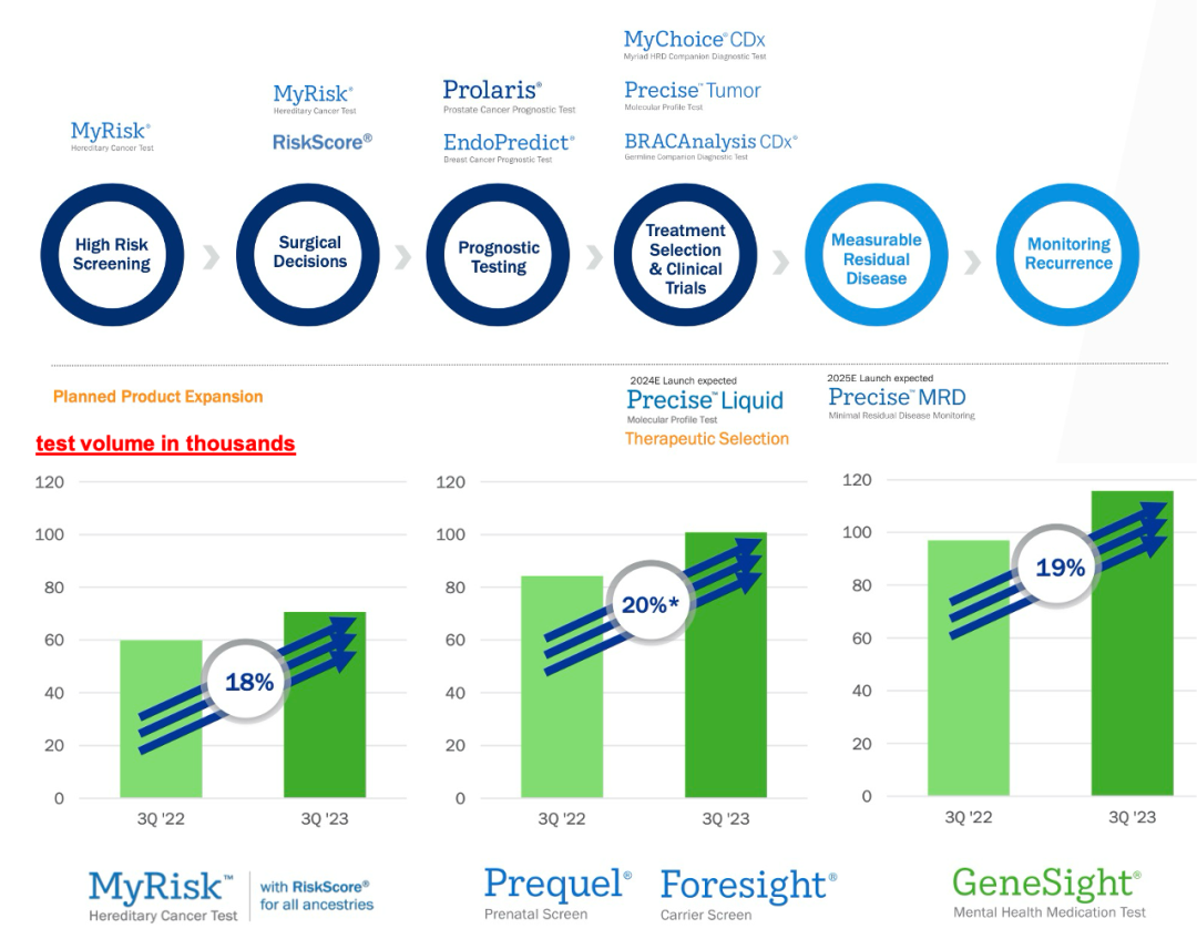 23&Me和Invitae的主营业务实在离刚需很远。 当“好好吃饭、少熬夜、少喝酒、少抽烟”这些被列为主要检测获益的时候,不禁让人想问: 这和周董那首《听妈妈的话》有什么本质差别? Invitae还把自己唯一刚需的生殖健康业务卖给了Natera。属实把“剥离好业务,留下差资产”这件事情给玩明白了。 当然,这个问题也可以换个角度来看: 当invitae摊开来任选的时候,Natera为什么只买了invitae的生殖健康业务? 最后,说起遗传检测这个“非刚需”业务,有一个鼻祖不得不说:Myriad。 准确来说,这股风气就是它带起来的——当年安吉丽娜·朱莉的案例可谓是这个行业的一针“兴奋剂”。 但为什么作为遗传检测的带头大哥,Myriad至今尚好? 看看大哥的业务组成,答案一目了然: “因为大哥背叛了革命” |