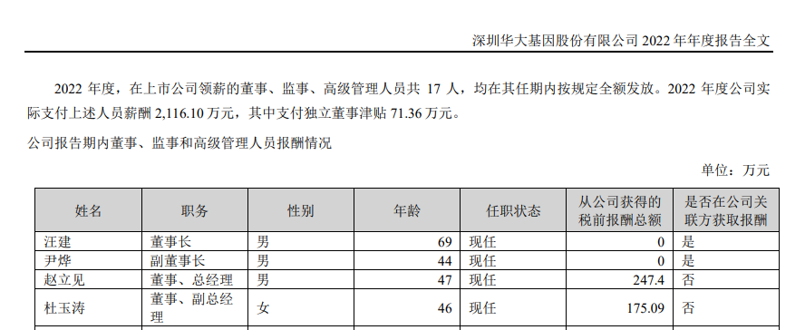 2021年6月,华大基因董事会聘任赵立见先生为公司总经理,尹烨先生不再担任华大基因总经理,转任华大集团CEO。2022年年报查询,赵立见的薪酬为247.4万元,并持有华大基因股份86300股。 1999年,中国参与“人类基因组计划”,华大诞生。彼时还没有从大学毕业的赵立见,是华大第一批实习生。“有人将工作比喻成谈恋爱,对我来说,华大就像我的‘初恋’一样。”赵立见说。伴随着刚刚诞生的华大,赵立见完成了从学校到工作的过渡,走过一个又一个的春秋,见证着华大一步步的成长。赵立见,男,1976 年出生,中国国籍,无境外居留权。本科。现任华大基因董事、总经理。曾任华大基因首席市场官、生育健康事业部负责人、运营团队成员并分管华大基因华南区业务,深圳华大基因医学有限公司(现已与深圳华大基 因科技服务有限公司合并为华大基因)运营团队成员。从赵立见的职业发展轨迹来看,其毕业于医科大学,预防医学背景,参与过华大的多个科研项目,属于专业技术型人才。后来又管理运营市场、事业部、公司区域业务,集技术、市场、管理、运营多种优秀能力于一身。再加之,在抗疫过程中的优秀表现,获得了董事会的信任和支持。作为华大的灵魂人物,董事长汪建近年来已经较少出现在公司的官方报道,更多是在关键时期以自身行动来感召员工,比如在抗疫初期赴武汉建立火眼、万米深潜探索海洋密码等。 在2021年上任总经理的赵立见,承担着华大基因后疫情时代稳健运营的重担。 从赵立见一些公开的报道中,可以看到他的一些思路和举措。2022年,在全球企业经营环境不确定性高的背景下,聚焦于生育健康、肿瘤防控和传感染疾病防控,并实现了相关产品的迭代、升级,着力自身的中长期发展。2023年,时刻保持战略定力,推动全球公共卫生体系建设,以新模式、新思路、新技术、新场景引领基因组学在精准医学领域的创新发展。