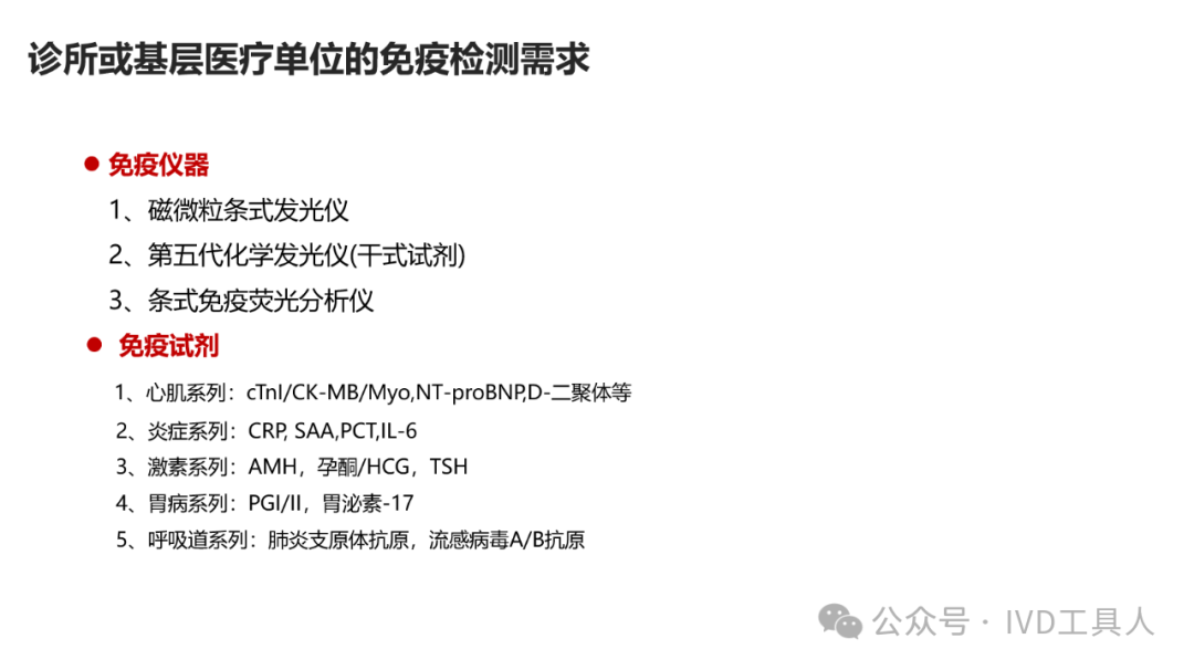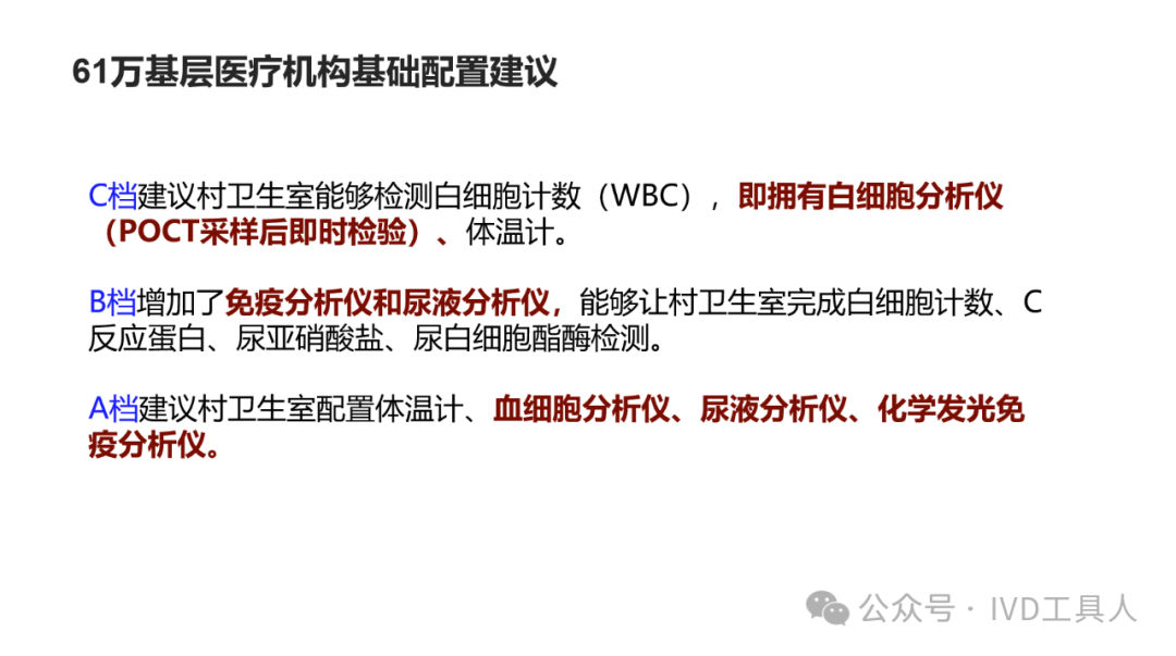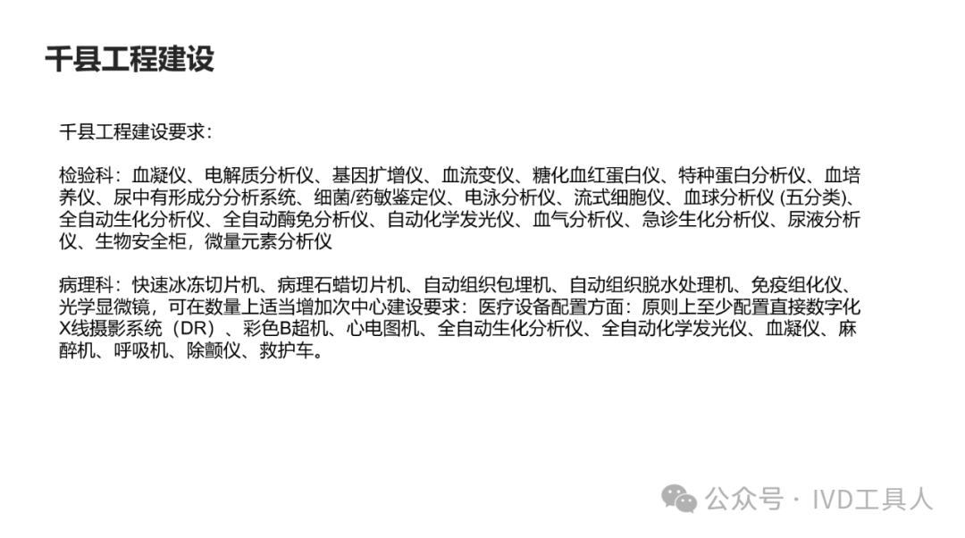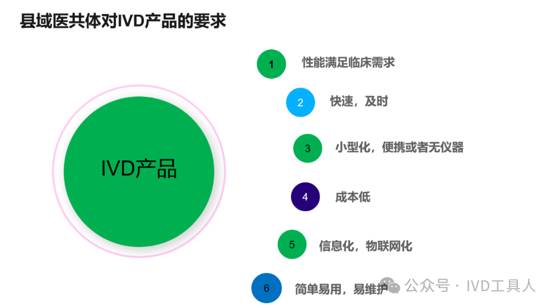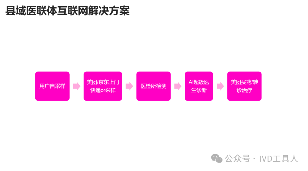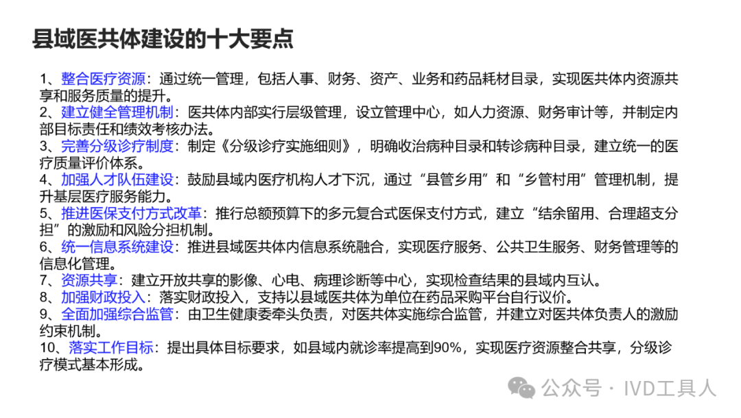 创新,革命老产品,重新划分存量市场,最难!物理化学生物各个学科的底层技术没有突破,在诊断上就更难有创新。AI的应用,不知道是否可以引起IVD的革命,可能在图像分析,联合指标分析等方面上会有广泛应用。 出海,与欧美产品一较高下,在国内主场还没完全打赢,去客场打,难度可想而知。率先要去争夺的还是亚洲,中东,非洲和南美。拿下第三世界的医疗,走农村包围城市的路线。下沉,挖掘县域医疗的需求。一线企业也在下沉,留给中小企业的机会也不多。但是县域医疗是个辛苦活,利益分割地比较散,山高皇帝远,一个地方有一个地方的分配格局,厂家和经销商还是可以努力一下。但是财政改革,城债出清,也要从县域开始,不知道对医共体建设是否会有影响。本文将梳理,对于县域医疗共同体的建设中,IVD企业能做什么贡献,挖掘什么商机。文末留言666,加小编进县域群!