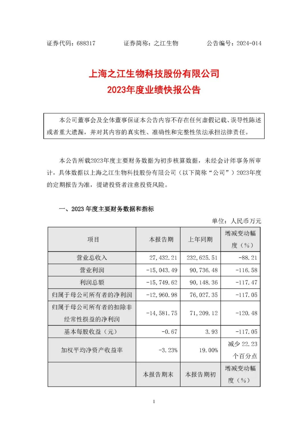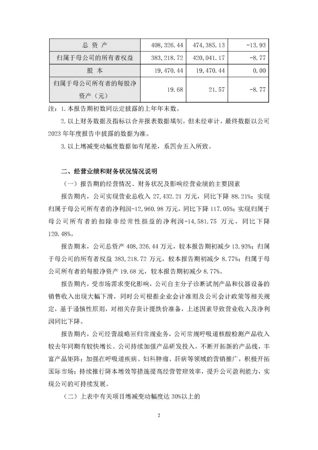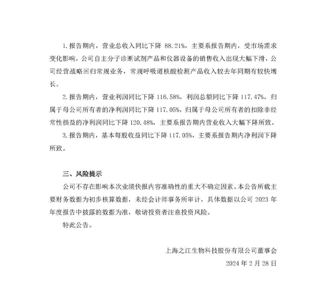 之江生物2月27日晚间发布业绩快报,2023年营业总收入2.74亿元,同比下降88.21%;净利润亏损1.3亿元,同比下降117.05%。报告期内,受市场需求变化影响,公司自主分子诊断试剂产品和仪器设备的销售收入出现大幅下滑。 而2022年,之江生物营收为23.26亿元,净利润7.6亿元。 报告期内,公司经营战略回归常规业务,公司常规呼吸道核酸检测产品收入较去年同期有较快增长。公司持续加强产品研发投入,不断开拓新的产品线,丰富产品矩阵;加强在呼吸道疾病、妇科肿瘤、肝病等领域的营销推广,积极开拓国际市场;持续推行降本增效等措施提高经营管理效率,提升公司盈利能力,实现公司的可持续发展。 |