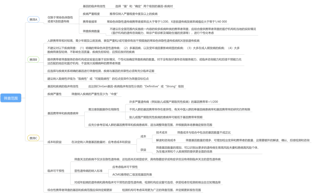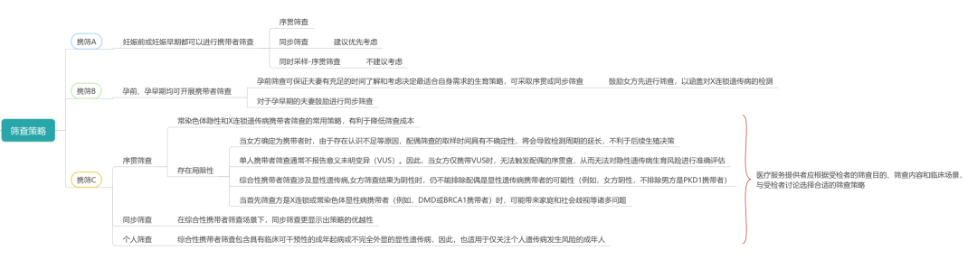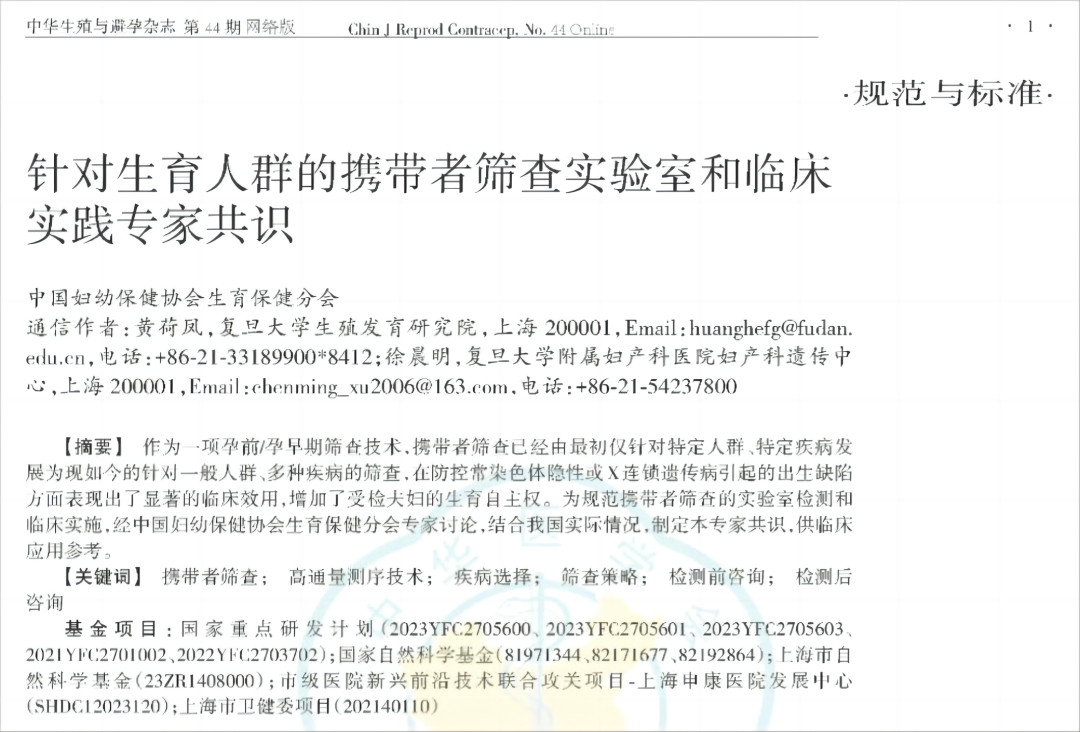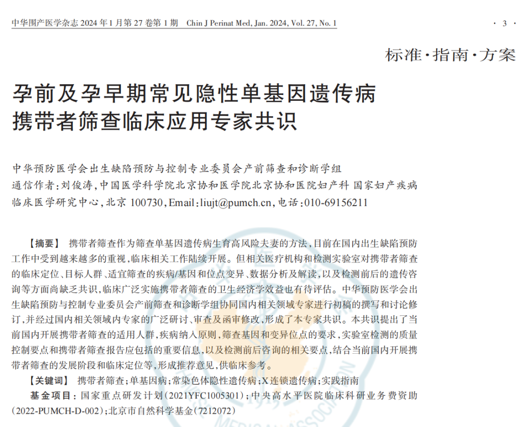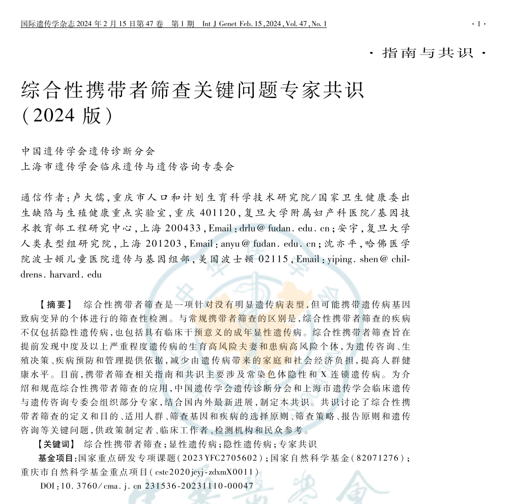 | 日前,中国遗传学会遗传诊断分会,上海市遗传学会临床遗传与遗传咨询专委会编写的《综合性携带者筛查关键问题专家共识(2024版)》发布。于此之前,由中国妇幼保健协会生育保健分会组织专家编写的《针对生育人群的携带者筛查实验室和临床实践专家共识》,全国产前诊断技术专家组联合中华预防医学会出生缺陷预防与控制专业委员会产前筛查和诊断学组及国内相关领域专家也刊出了《孕前及孕早期常见隐性单基因遗传病携带者筛查临床应用专家共识》,三版共识内容亦有异同,本文就三篇共识进行对比总结,旨在为读者提供参考信息。《针对生育人群的携带者筛查实验室和临床实践专家共识》(后简称携筛A)是国内首个基于实验室和临床实践经验,专注于生育人群的携带者筛查的专家共识。该共识结合我国现状,分析中国人群携带者筛查的实验室与临床实践研究成果,针对中国人群携带者筛查的适用人群、疾病选择、实施策略、实验室检测和遗传咨询等核心内容与关键问题形成共识,指出我国随着高通量测序技术的快速发展,携带者筛查也逐步实现了从单一疾病向多种疾病,由特定高危种族人群到泛种族普通人群的转变,并取得了良好的防控效果。《孕前及孕早期常见隐性单基因遗传病携带者筛查临床应用专家共识》(后简称携筛B)对当前国内开展携带者筛查的适用人群,疾病纳入原则,筛查基因和变异位点的要求,实验室检测的质量控制要点和携带者筛查报告应包括的重要信息,以及检测前后咨询的相关要点,结合当前国内开展携带者筛查的发展阶段和临床定位等,形成推荐意见,并评估伦理与卫生经济学相关问题,为临床提供参考。《综合性携带者筛查关键问题专家共识(2024版)》(后简称携筛C)讨论了同时涵盖常染色体显性遗传病的综合性携带者筛查的定义和目的、适用人群、筛查基因和疾病的选择原则、筛查策略、报告原则和遗传咨询等关键问题,并形成共识。综合性携带者筛查是一项针对没有明显遗传病表型,但可能携带遗传病基因致病变异的个体进行的筛查性检测,旨在提前发现中度及以上严重程度遗传病的生育高风险夫妻和患病高风险个体,为遗传咨询、生殖决策、疾病预防和管理提供依据,减少由遗传病带来的家庭和社会经济负担,提高人群健康水平。本节就共识中提到的适用人群、筛查范围、筛查策略及解读报告原则进行了总结和对比:在三版共识中,对于关注子代健康,有生育意愿、期望通过携带者筛查评估生育隐性遗传病患儿的夫妇,推荐进行携带者筛查;对于有亲属存在高度疑似遗传性疾病的情况,应建议针对先证者进行完善的遗传咨询与诊断,以制定相应的孕前干预或孕期产前诊断方案。《综合性携带者筛查专家共识》中指出综合性携带者筛查不仅适用于关注子代健康的备孕和孕期夫妻,也适用于关注自身健康的成年人。在三版共识中均建议筛查基因疾病关系明确,疾病与基因的关联性有充分临床证据、携带率高、表型严重、临床可干预的常染色体隐性或X连锁遗传病;疾病筛查的选择应结合提供携带者筛查服务的机构、当地的实际情况等进行个性化考虑。《综合性携带者筛查专家共识》中指出对成年起病的遗传病和具有临床可干预性的显性遗传病,检测机构应设置可选项,供受检者在检测前做出自主知情选择。三版共识中都指出在妊娠前及妊娠早期均可进行携带者筛查,对于有充足时间了解和考虑决定生育策略的孕前筛查可选择同步筛查或序贯筛查,而对于孕早期的夫妻鼓励进行同步筛查节约时间成本,且全面评估筛查范围内子代和个人的遗传病患病风险。同步筛查与序贯筛查各有优劣,因此医疗服务提供者应根据受检者的筛查目的、筛查内容和临床场景,与受检者讨论选择合适的筛查策略。报告原则方面,三版共识均建议报告致病变异和可能致病变异。《针对生育人群的携带者筛查实验室和临床实践专家共识》中指出针对特殊情况可以选择报告VUS变异:实验室可以考虑在取得受检者及其配偶知情同意后,对有可能重分析后定级为P/LP的VUS变异(贝叶斯评分4-5分)进行报告;《综合性携带者筛查专家共识》中也提到检测机构在制定实验室变异报告策略时,应考虑VUS、低外显率变异、亚效变异和风险变异等非常规报告变异的报告原则。 目前大多数遗传病缺乏治愈方法,然而,通过携带者筛查提前发现可能生育遗传病患儿的高风险夫妻和遗传病患病高风险个体,可以为遗传咨询、生殖决策疾病预防和管理提供依据,减少由遗传病带来的家庭和社会经济负担,提高人群健康水平。三篇专家共识的发布标志着单基因遗传病携带者筛查在国内的临床应用探索迈进新发展阶段,重点强调了在孕前或孕早期开展携带者筛查具有重要意义,通过给予科学的生育指导,真正做到出生缺陷防控关口前移,大幅降低筛查疾病在子代中的发生率。