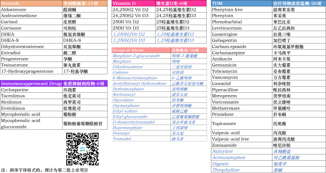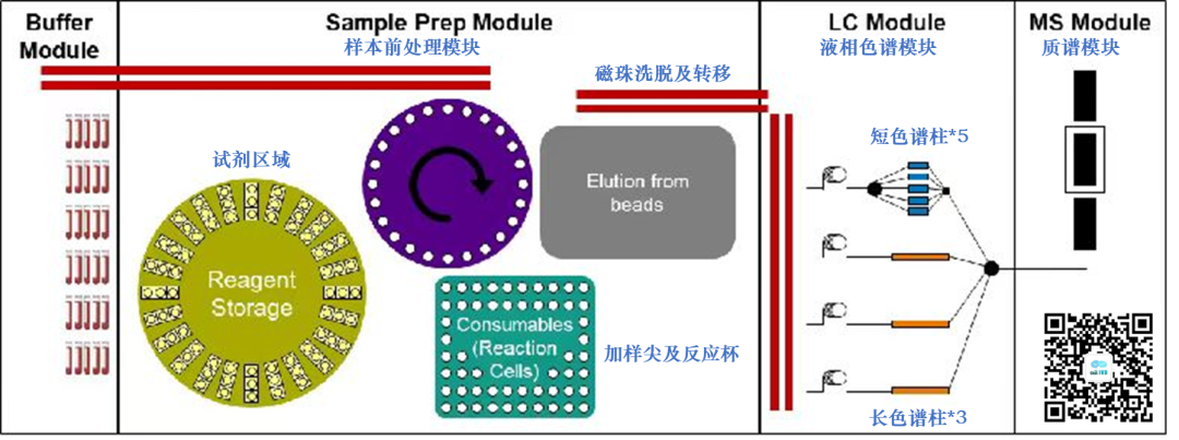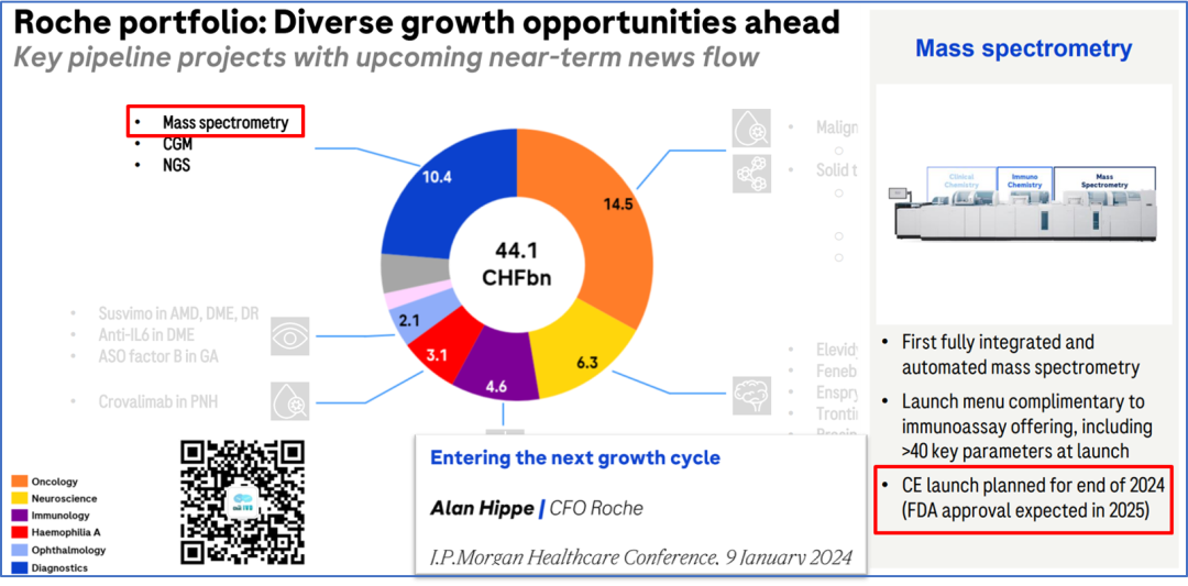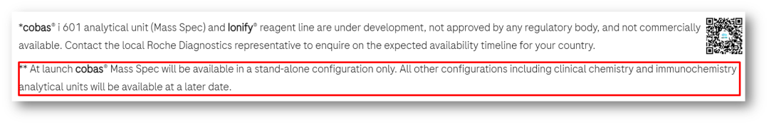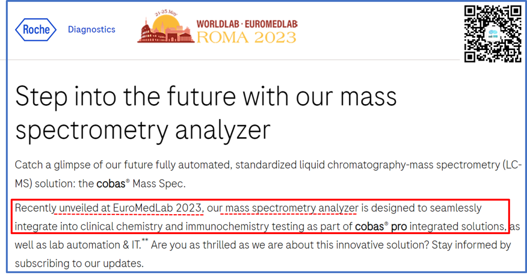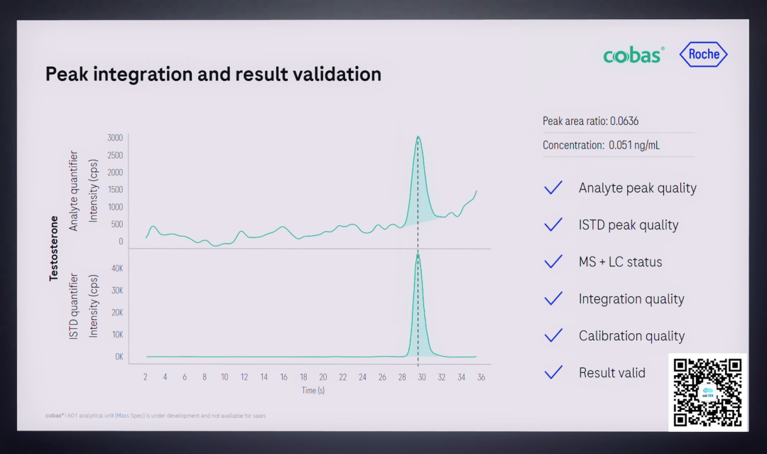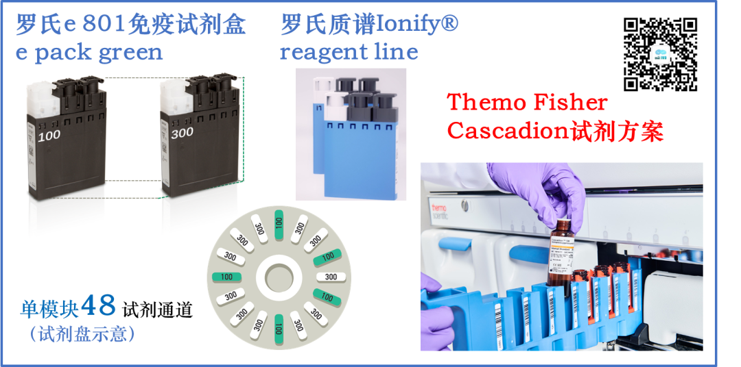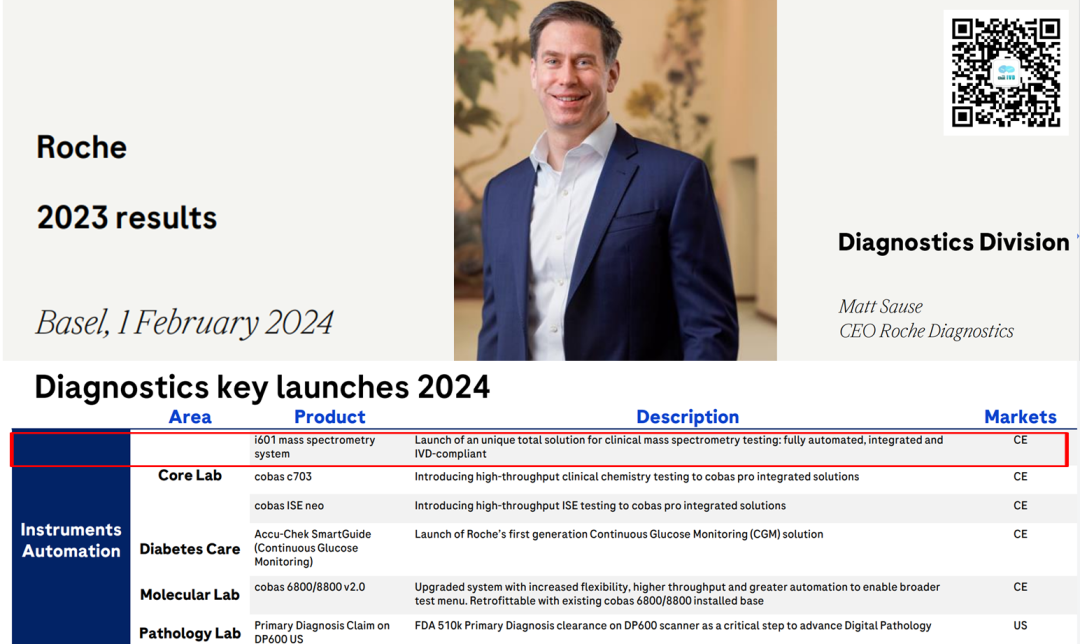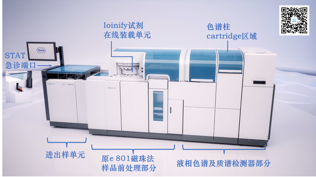 距离上一年度罗氏的半年报中公布了比较多的临床质谱方案细节后,又过去了半年时间,按其规划,2024年底将会在欧洲率先上市。 随着上市时间的临近,按着新品上市的一般推进流程,罗氏公司也不断对外公布了一些最新细节,使得其质谱方案的神秘面纱也一层一层的逐渐揭开。 在临床质谱火热之际,我们之所以如此关注罗氏公司的质谱项目,还是基于业界对罗氏公司全自动质谱方案的高度期望,尤其在科学仪器巨头赛默飞世尔(Thermo Fisher)公司全自动质谱一体机Cascadion项目以失败告终之后,我们更期待IVD巨头的解决方案。 看从IVD企业的方向是否可以走通,彻底解决临床质谱自动化,推进临床质谱进入临床检测科室,完成临床质谱普及的最后一公里路。 本文仅为分享临床质谱相关知识、探讨质谱自动化方案,以期质谱技术在临床端的进一步发展。质谱技术的普及,需要各级别企业的共同努力,有大象起舞,也有蚂蚁雄兵。文中内容仅为技术探讨,是对公开信息的进一步学习、推测和探讨,如有理解偏差、不准确的地方,请仅以罗氏公司未来官方资料及解释为准。我们敬重头部企业罗氏这么有创新的技术尝试且需保护相应的专属设计,也期待各家质谱相关公司凭借独立的创新精神取得各自的突破。 01 上市计划进展 简言之,如期推进! 落地时间与之前公布的信息没有变化,侧面证明在欧美地区的注册工作顺利、项目的研发按期望进展。 2024年1月9日,在第42届摩根大通医疗健康大会(JPM 2024年2月初发布的2023年财报中,在诊断部CEO Matt Sause的报告部分,也看到他把i601全自动质谱系统在2024年CE落地作为他的首条关键任务。 我们还注意到,2023年5月,在意大利罗马举行的第25届国际临床化学与检验医学大会(IFCC WORLDLAB)暨第25届欧洲临床化学与检验医学大会(EUROMEDLAB)上,罗氏也将其质谱系统进行了揭幕,为欧洲市场的上市预热。 关于中国的上市时间,按业内推测及罗氏新产品在中国上市的规划传统,预计在2026年争取拿到国内上市资质。 值得提及的一件事情,在2023年12月国家卫健委临检中心第二届临床质谱的培训班上,很高兴的看到罗氏公司RA注册部相关人员也来学习质谱相关内容。 质谱技术对于罗氏公司也是一项新技术、新方法,为了做好相关注册工作、确保注册进度,相关人员主动学习相关知识,值得认可肯定! 02 设备整体结构 从左到右依次为进出样单元(含STAT急诊端口)、加样及磁珠前处理部分、色谱质谱部分。总体的尺寸并没有相关资料公布,但参照图片里其他模块的尺寸(e801及进样模块尺寸),按比例可大致估算,整体的设备长度约3.8米(含进样单元)。 其中色谱质谱部分从图中可以看出比e801(含MSB样本缓冲区)尺寸略短一些,我们姑且按1.4米算。 关于重量,我们也做个大概估算:考虑到色谱质谱部分有泵单元、分子涡轮泵、质量分析器等重量较大组件,整体重量应大于等于e801的730公斤,所以三者相加(190+730+>730)整体重量应在1.7吨上下。 设备的整体结构,可以理解为进样单元,加上e801系统(含MSB样本缓冲区、无ECL电化学发光的检测系统),后面再加一个液相色谱及质谱分析仪部分。 此系统的e801部分,负责样品的进出样,传输,样品的加入,试剂的加入,基于磁珠的前处理等的流程,最后转移至液相色谱部分,进行液质分析相关步骤。 03 质谱试剂产线 在公布了质谱系统的型号i601之后,质谱的试剂盒也有了它的名称:Ionify(已注册商标),并形成Ionify® 至此,我们又可以大胆的猜测i601质谱系统这个cobas i系列的命名起源,那就是也是源于Ion离子这个词,与其免疫系统的e来自Electro ChemiLuminescence (ECL) elecsys电化学发光系统、临床生化的c来自Clinical Chemistry形成家族化命名逻辑,共同组成cobas中心实验室的主力机型系列。 试剂盒形式沿用cobas生化、免疫系统的cassettes式设计,即试剂多联包形式,从截图可看出也为3组分、尺寸与免疫e green package一致,这也使得其能兼容使用免疫系统e801的试剂处理单元,享用在线装卸载试剂功能。 若如猜测与e pack green试剂盒大小一致且试剂仓一致,则单模块也可以放置48个试剂。 我们可以对比下罗氏的质谱试剂与赛默飞世尔的Cascadion质谱系统的试剂,从临床使用角度,罗氏的即开即用、成分整合、可高度自动化的试剂更符合临床工作人员的喜好。 04 样本前处理工作流程 质谱检测与生化免疫等其他间接检测(检测器隔检测杯读值、非直接接触待检物)不同,其待检物质是被吞进检测单元的,是直接读取待检物M/Z质荷比的一种技术,无需标记物。 但血清中的成分非常复杂,有大量的磷脂、蛋白等基质杂质成分,待检成分只是非常少的一些物质,所以质谱检测是需要进行样本纯化后才能进样的,尽可能纯的待检物质可降低基质干扰,提升检测的灵敏度和准确性。 样本前处理工作由于步骤复杂,目前是临床质谱分析的一个难点和重点,也是各家临床质谱自动化方案主要需解决的关键步骤。在众多的前处理方法中,磁珠法(或称萃取磁珠法)是最有希望实现高通量、自动化、标准化的,国内也有很多公司在这个方向下取得了卓有成效的进展。 这里我们看到罗氏采用的是磁珠法的方案,其过程简要整理如下: 此部分用到的各类试剂应主要来自Ionify的试剂包部分,从图中可大致判断罗氏的磁珠方案为正向抓取待检物的模式,磁珠依靠binder正向结合、抓取待检物质,最后洗脱下待检物质与内标