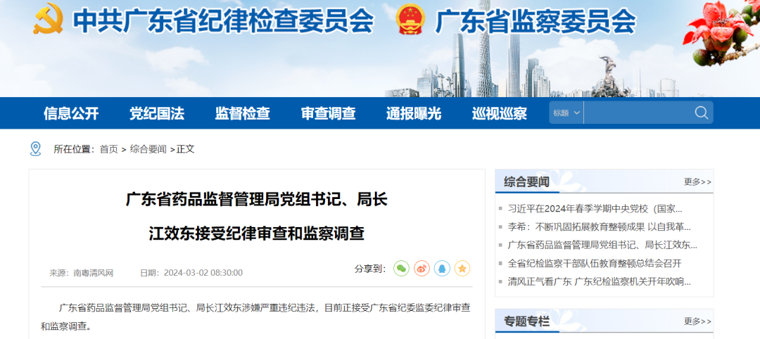 3月2日,广东省纪委监委发布消息,省药品监督管理局党组书记、局长江效东涉嫌严重违纪违法,目前正接受审查调查。 江效东 资料图 江效东出生于1964年2月,广东揭阳人,早年在卫计系统工作,2006年7月任省人口计生委副主任(机构改革后为省卫生计生委副主任)。 2017年4月起,江效东先后担任省工商局副局长、省医保局副局长,并于2020年2月出任省药监局局长,直至此番被查。 近期,广东省卫生系统,多个领导(前领导)落马: 去年10月19日消息,原广东省卫生和计划生育委员会党组副书记、主任陈元胜被查。他历任广东省食品药品监督管理局党组书记、局长;广东省卫生厅党组书记、副厅长,党组书记、厅长;广东省卫生和计划生育委员会党组副书记、主任;广东省政协科教卫体委主任,提案委主任。2019年2月退休。 去年11月11日消息,广东省卫生健康委党组书记、主任朱宏涉嫌严重违纪违法,主动投案。他历任南方医科大学南方医院党委委员、副院长,广东省医学学术交流中心主任,南方医科大学南方医院党委书记,广东省卫生健康委党组书记、主任。 去年12月24日消息,广东省卫生健康委党组成员、副主任,省中医药局党组书记、局长徐庆锋被查。他历任广东省卫生计生委党组成员、副主任,省中医药局局长;广东省卫生健康委党组成员、副主任,省中医药局党组书记、局长。 今年1月5日消息,广东省药品监督管理局药品监督管理二处处长田守刚被查。他历任广东省食品药品监督管理局办公室副主任,广东省药品监督管理局化妆品监督管理处副处长、药品监督管理二处处长。 |