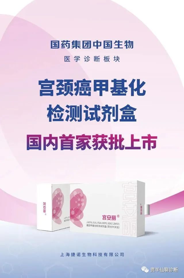 宫安丽使用甲基化特异性的PCR方法,通过检测人宫颈脱落细胞中6个基因的甲基化状态,帮助识别HPV DNA检测初筛阳性人群是否需要行进一步的阴道镜检查。2023年3月,NMPA正式批准北京起源聚禾生物科技有限公司自主研发的人PAX1和JAM3基因甲基化检测试剂盒(PCR-荧光探针法)(商品名:禾宫康CISCER®)上市,是宫颈癌领域的第二个甲基化产品。