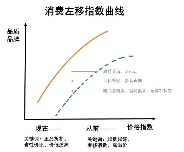 最近的一个新词:消费左移,以价格为横坐标,品质为纵坐标,在经济下行的社会背景下,大家既对价格敏感,倾向于低价消费,同时又想最大程度保持应有的商品品质或消费品质。反映在这个坐标系上,就是大众的消费诉求开始向左平移。