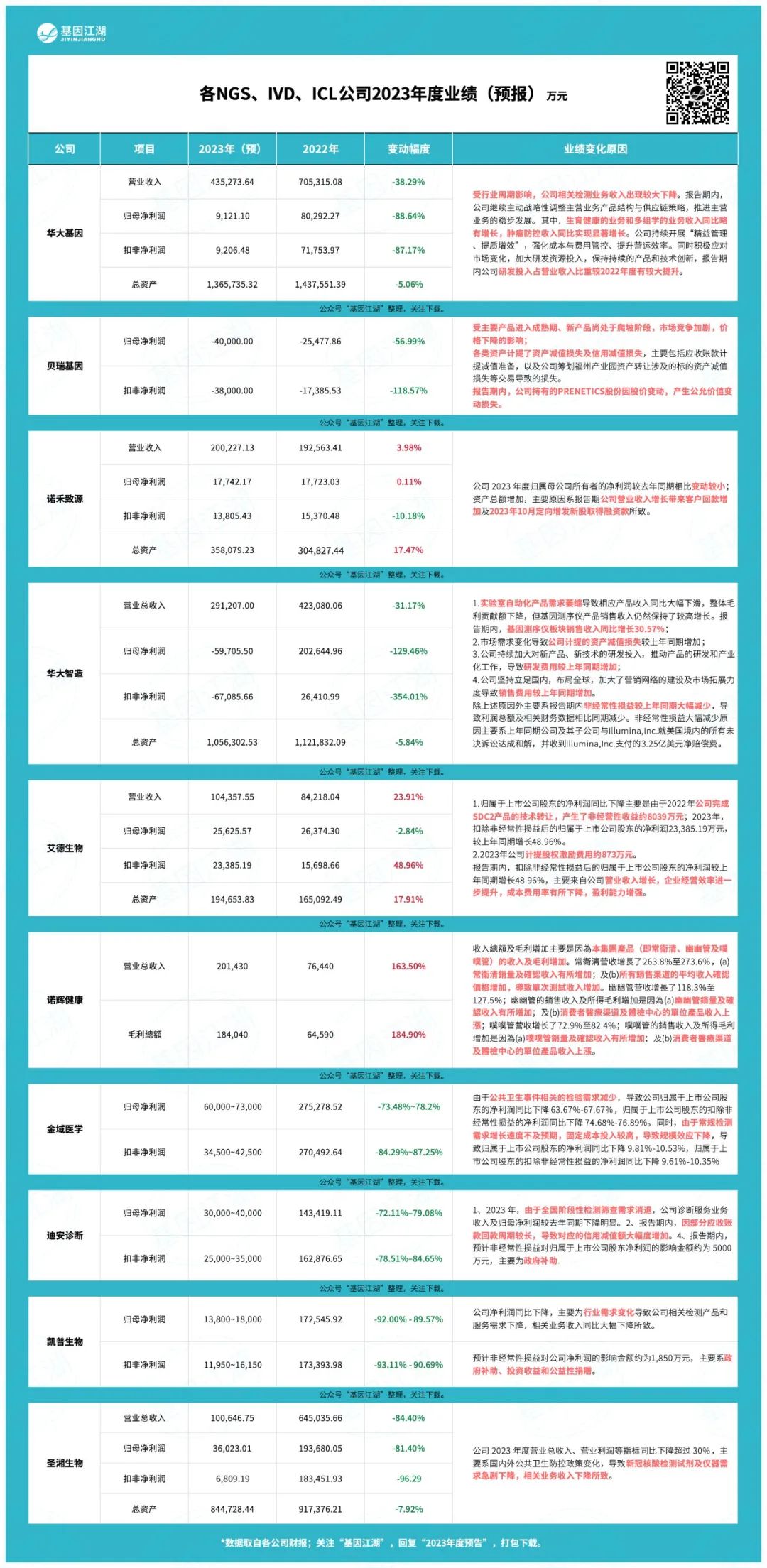 这是新冠之后的第一个财报年,尤为特殊,也尤为关键。 数据摘自各公司财报预告,整理如下: 整体而言: (1)新冠获益企业,在2023年回归正常轨道,所以营收及净利润出现大幅下降,情理之中,不用扩大解读; (2)大部分新冠获益企业都加大了研发投入占比(或布局新业务、融资并购); (3)市场面临常规检测(成熟产品)增速下降、新产品爬坡、利润空间降低等状况; (4)诺辉健康肠癌早筛产品“常卫清”年度单品破10亿元,同比增长235.2%、圣湘生物呼吸道类产品营业收入超4亿元,同比增长达680%;两家表现尤为亮眼;也为行业模式的转型,提供了有益参考。 |