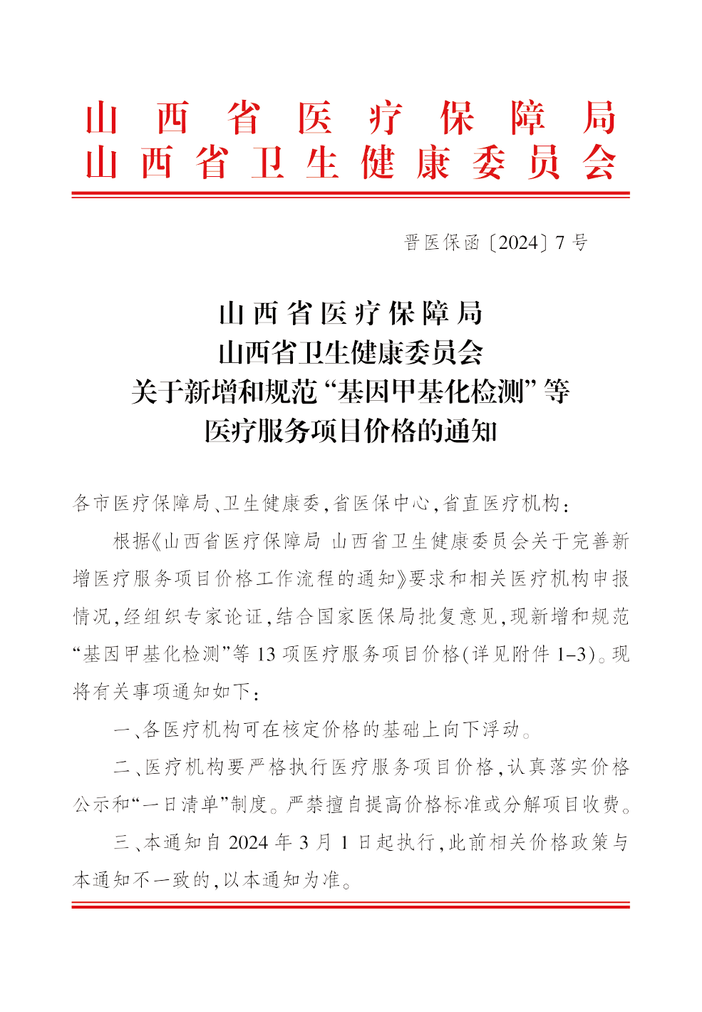 近日,山西省医疗保障局、山西省卫生健康委员会发布《关于新增和规范“基因甲基化检测”等医疗服务项目价格的通知》(晋医保函[2024]7号),基因甲基化检测项目(项目编码250503014)纳入山西省乙类医保支付范围,提供全省医保覆盖,自2024年3月1日起执行。 2023年国家癌症中心发布数据显示,山西省十大高发癌症依次是肺癌、胃癌、食管癌、结直肠癌、肝癌、乳腺癌、子宫颈癌、甲状腺癌、膀胱癌、肾癌。其中,胃癌、食管癌、结直肠癌、肝癌等消化系统癌症在山西省高发,这些癌症的发病率和死亡率都较高,给当地人民的健康带来了极大的威胁。 图片来源:网络 山西是继北京之后,第二个将基因甲基化检测整体纳入医保项目的省份,这无疑为该省的居民带来了福音。随着甲基化检测技术的广泛运用,癌症早筛的重要性将日益凸显,癌症早筛的准确性和可靠性将有效提高,人们将更加注重自我健康管理,积极做自己健康的第一守护者。 随着人们对自身健康的关注,癌症早筛早诊将成为一种必然,基因甲基化检测作为癌症高危人群早诊早筛的检测手段,被更多的省市纳入医保也将成为一种趋势。这将为我国的医疗卫生事业带来新的活力,为实现健康中国的宏伟目标做出积极的贡献。 |