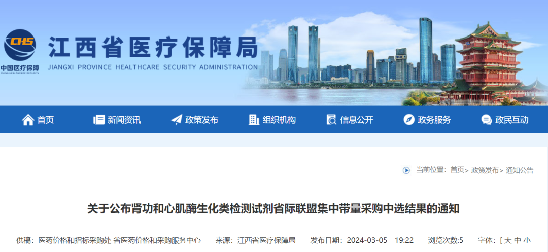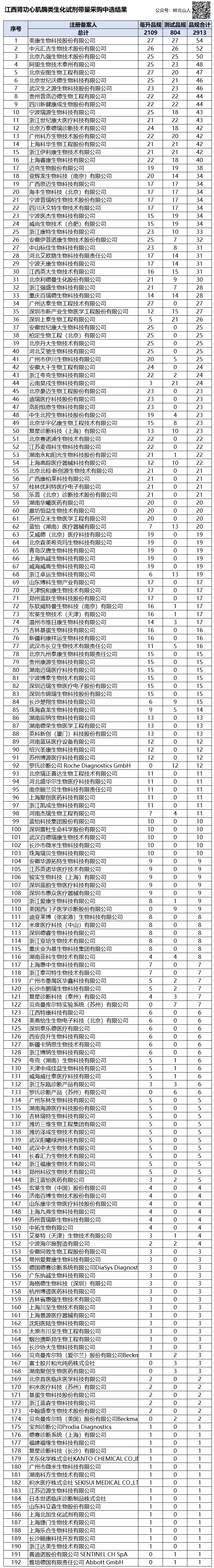 3月5日,江西医保局发布通知,关于肾功和心肌酶生化类检测试剂省际联盟集中带量采购中选结果的公示。  根据《肾功和心肌酶生化类检测试剂省际联盟集中带量采购文件(JX-HC2023-01)》规定,现公布肾功和心肌酶生化类检测试剂省际联盟集中带量采购中选结果。根据中选结果,此次带量采购,共有211个厂家参与报价,8个厂家未参与。截至11:00解密截止,211家企业中,成功解密的有210家。