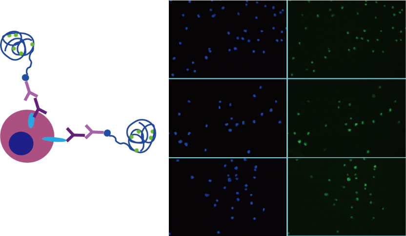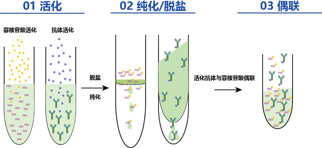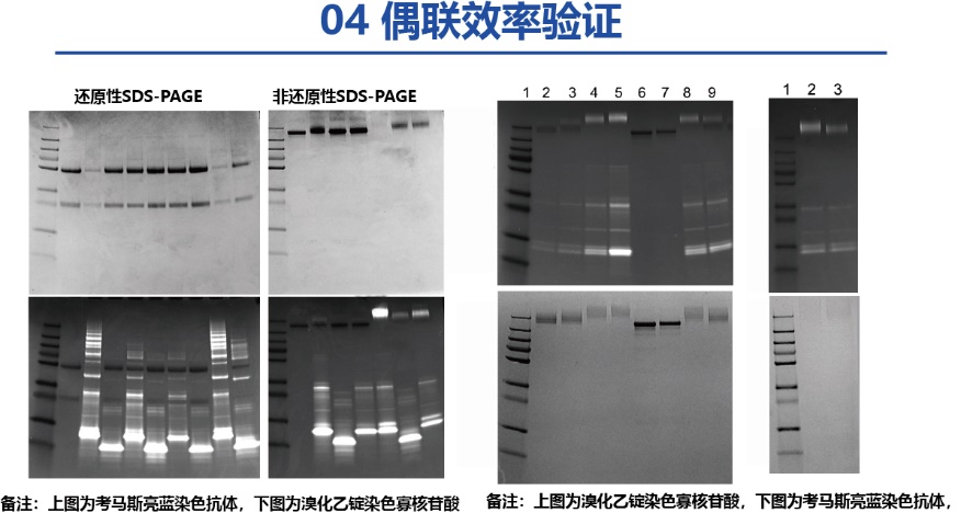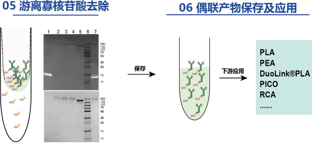 寡核苷酸偶联试剂盒可高效的生成寡核苷酸偶联抗体,本试剂盒使用的生物偶联试剂含有具有反应活性的末端,可与含有氨基的抗体、蛋白、多肽或氨基修饰的寡核苷酸进行偶联反应。该试剂盒包括阳性对照允许用户确认偶联反应是否正常工作,可用于抗体与 20-120 的单链寡核苷酸或双链寡核苷酸偶联,偶联使用的寡核苷酸应包含氨基修饰的末端。 实验流程 寡核苷酸与抗体的活化与偶联 将寡核苷酸活化剂和抗体活化剂按照说明书要求溶解配置后,分别按照一定比例加入到寡核苷酸和抗体中,孵育。孵育结束后分别使用纯化柱和脱盐柱进行纯化和脱盐,得到功能基团活化标记的寡核苷酸和抗体。进一步将活化的寡核苷酸和抗体按照一定的摩尔比混合孵育过夜,即可得到抗体-寡核苷酸偶联物。 偶联效果验证 通过SDS-PAGE还原性或者是非还原性电泳检测偶联效果。考马斯亮蓝染色显示蛋白条带位置,此外通过溴化乙锭染色寡核苷酸可以更为显著的观察抗体-寡核苷酸是否偶联成功,如下图。偶联剂不同的稀释比例、不同的稀释缓冲液、以及孵育时间等对偶联效果均具有一定的影响,因此,本试剂盒提供活化剂配套的缓冲液、及建议的稀释比例等条件,充分保证您实验的顺利开展。 游离寡核苷酸的去除及偶联产物保存 通过超滤方式去除游离未结合的寡核苷酸。为保证偶联反应中的抗体能够完全与寡核苷酸结合,在偶联反应中会投入过量的寡核苷酸,而在偶联反应结束后,将通过超滤的方式去除未结合的游离寡核苷酸,降低对下游检测实验的干扰,通过超滤方式去除游离寡核苷酸,高效、简便,并且对偶联产物的损失和功能几乎无影响。 寡核苷酸去除效果与超滤次数有相关性,可根据试剂盒说明书的建议进行,首次实验建议进行条件本摸索。本试剂盒提供超滤所需要用到的材料,方便您的使用。 寡核苷酸偶联抗体的长期稳定性取决于多个因素,包括抗体和寡核苷酸本身、保存温度和保存条件。若短期使用建议在超滤缓冲液中-20摄氏度保存,如果长期使用及后续实验不受干扰,可在50%甘油条件下保存。偶联反应剩余的活化寡核苷酸和活化抗体可-20℃保存一个月。 案例分享 本试剂盒的性能已通过多种类型下游检测分析实验进行验证。 案例1: 基于PLA原理设计寡核苷酸序列,寡核苷酸序列与特定抗体对偶联后,通过qPCR检测缓冲液及血清中靶分子的浓度,实现超低浓度蛋白分子的检测,靶分子的浓度与qPCR的Ct值呈负相关。 案例2: 基于PICO原理设计寡核苷酸序列和选择抗体对,检测样本中互作蛋白对的浓度,通过dPCR检测蛋白分子的浓度与阳性液滴数直接的关系,结果相关阳性液滴数与投入靶标呈正相关。 案例3: 基于免疫PCR原理,将RCA模板与引物退火后与二抗偶联,通过RCA扩增时加入荧光探针,实现信号放大,检测细胞中超低浓度蛋白的表达。该方法可根据寡核苷酸序列的不同及样品类型扩展多种应用模式。 杭州乐为生医科技有限公司根据客户需求提供抗体寡核苷酸偶联试剂盒及抗体寡核苷酸偶联技术服务,提供专业的售前技术指导及售后技术支持,为您的科研报价护航。 全国销售联系方式:19957893538 全国技术支持电话:18611591243 |