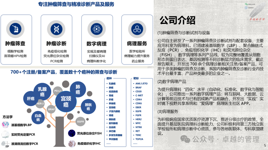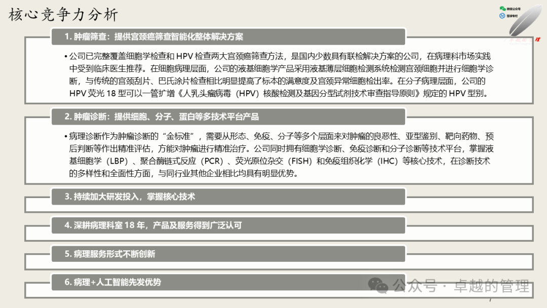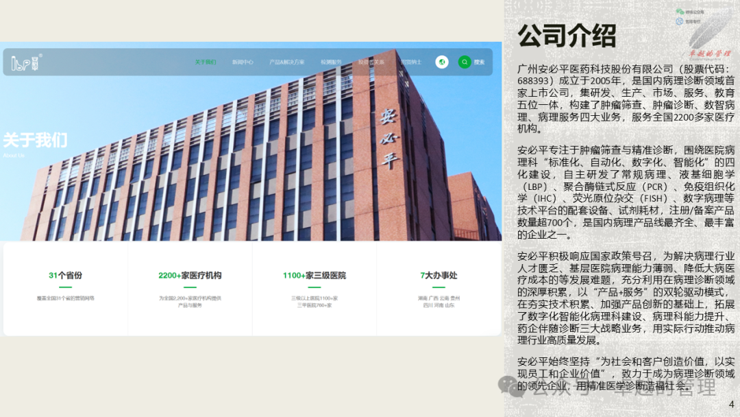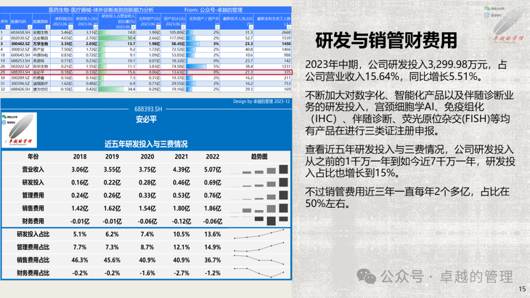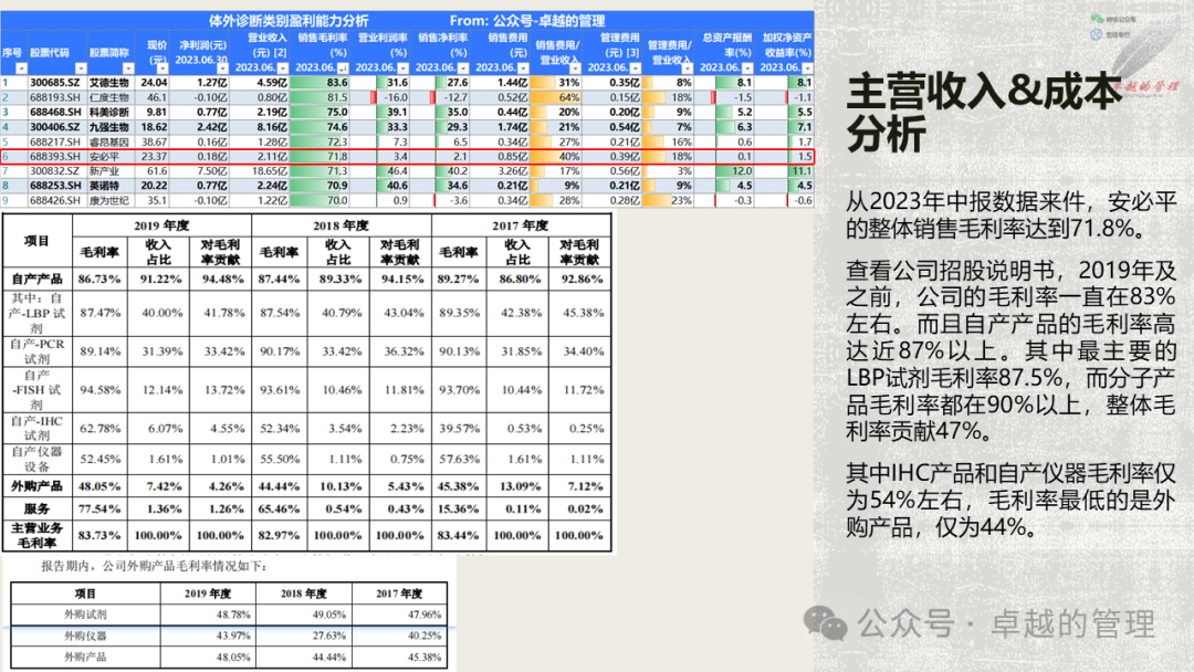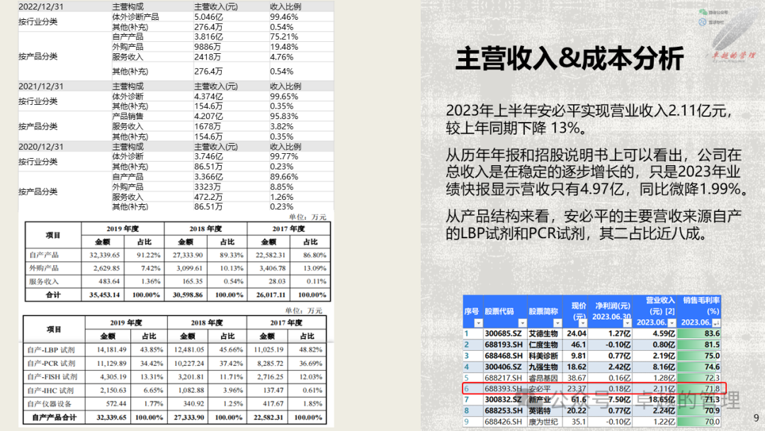 文字版 一、公司介绍 广州安必平医药科技股份有限公司(股票代码:688393)成立于2005年,是国内病理诊断领域首家上市公司,集研发、生产、市场、服务、教育五位一体,构建了肿瘤筛查、肿瘤诊断、数智病理、病理服务四大业务,服务全国2200多家医疗机构。 安必平专注于肿瘤筛查与精准诊断,围绕医院病理科“标准化、自动化、数字化、智能化”的四化建设,自主研发了常规病理、液基细胞学(LBP)、聚合酶链式反应(PCR)、免疫组织化学(IHC)、荧光原位杂交(FISH)、数字病理等技术平台的配套设备、试剂耗材,注册/备案产品数量超700个,是国内病理产品线最齐全、最丰富的企业之一。 安必平积极响应国家政策号召,为解决病理行业人才匮乏、基层医院病理能力薄弱、降低大病医疗成本的等发展难题,充分利用在病理诊断领域的深厚积累,以“产品+服务”的双轮驱动模式,在夯实技术积累、加强产品创新的基础上,拓展了数字化智能化病理科建设、病理科能力提升、药企伴随诊断三大战略业务,用实际行动推动病理行业高质量发展。 安必平始终坚持“为社会和客户创造价值,以实现员工和企业价值”,致力于成为病理诊断领域的领先企业,用精准医学诊断造福社会。 (1)肿瘤筛查与诊断试剂与设备 公司自主研发了一系列肿瘤筛查及诊断试剂与配套设备,主要应用科室为病理科。已搭建液基细胞学(LBP)、聚合酶链式反应(PCR)、免疫组织化学(IHC)和荧光原位杂交(FISH)、数字病理等系列产品线,较为完整地覆盖从细胞形态到蛋白表达、基因检测等不同诊断层次的临床需求,截止报告期末,开发出 700 余个病理诊断相关注册/备案产品,可用于多类肿瘤的筛查及诊断,系国内肿瘤筛查及诊断行业内技术平台最丰富、产品种类最多的企业之一。 (2)数字病理产品 为提升病理科“四化”水平(自动化、标准化、数字化与智能化),公司推出一系列数字病理产品:将互联网、大数据、云计算等前沿技术与已有的成熟产品相融合,开发出“实视”实时镜下视野共享系统和“爱病理”病理医生社区 APP。 (3)病理服务 为积极响应国家优质医疗资源下沉、推进分级诊疗的政策,全面提升基层医院病理科诊断能力、公司积极利用第三方独立医学检验所和病理诊断中心资质,参与各地医联体、专科联盟建设。 二、核心竞争力分析 1. 肿瘤筛查:提供宫颈癌筛查智能化整体解决方案 公司已完整覆盖细胞学检查和 HPV 检查两大宫颈癌筛查方法,是国内少数具有联检解决方案的公司,在病理科市场实践中受到临床医生推荐。在细胞病理层面,公司的液基细胞学产品采用液基薄层细胞检测系统检测宫颈细胞并进行细胞学诊断,与传统的宫颈刮片、巴氏涂片检查相比明显提高了标本的满意度及宫颈异常细胞检出率。在分子病理层面,公司的 HPV 荧光 18 型可以一管扩增《人乳头瘤病毒(HPV)核酸检测及基因分型试剂技术审查指导原则》规定的 HPV 型别。 2. 肿瘤诊断:提供细胞、分子、蛋白等多技术平台产品 病理诊断作为肿瘤诊断的“金标准”,需要从形态、免疫、分子等多个层面来对肿瘤的良恶性、亚型鉴别、靶向药物、预后判断等作出精准评估,方能对肿瘤进行精准治疗。公司同时拥有细胞学诊断、免疫诊断和分子诊断等技术平台,掌握液基细胞学(LBP)、聚合酶链式反应(PCR)、荧光原位杂交(FISH)和免疫组织化学(IHC)等核心技术,在诊断技术的多样性和全面性方面,与同行业其他企业相比均具有明显优势。 3. 持续加大研发投入,掌握核心技术 4. 深耕病理科室 18 年,产品及服务得到广泛认可 5. 病理服务形式不断创新 6. 病理+人工智能先发优势 三、主营收入&成本分析 2023年上半年安必平实现营业收入2.11亿元,较上年同期下降 13%。 从历年年报和招股说明书上可以看出,公司在总收入是在稳定地逐步增长的,只是2023年业绩快报显示营收4.97亿,同比微降1.9%。 从产品结构来看,安必平的主要营收来源自产的LBP试剂和PCR试剂,其二占比近八成。 从2022年度财报和招股说明书可见,公司主要成本包括试剂成本,仪器成本仅占比13%。 仪器成本主要为直接材料,占比83%。而实际成本直接材料占比61%,直接材料主要为尼龙膜、Anstart Taq DNA Polymerase、探针引物和包装材料等。 制造费用占比26.9%,主要应该是水电费用及厂房、设备折旧等。 从2023年中报数据来件,安必平的整体销售毛利率达到71.8%。 查看公司招股说明书,2019年及之前,公司的毛利率一直在83%左右。而且自产产品的毛利率高达近87%以上。其中最主要的LBP试剂毛利率87.5%,而分子产品毛利率都在90%以上,整体毛利率贡献47%。 其中IHC产品和自产仪器毛利率仅为54%左右,毛利率最低的是外购产品,仅为44%。 四、客户和供应商 查看安必平连续三年供销关系,其中应收账款逐年增加,不过应收占营收比重呈缓慢下降趋势。 营收含金量一直在100%以上,尚可。 应付账款逐年下降,应付占营业成本的比重也逐年下降,而且营业成本的含金量也逐年增加。 五、研发与销管财费用 2023年中期,公司研发投入3,299.98万元,占公司营业收入15.64%,同比增长5.51%。 不断加大对数字化、智能化产品以及伴随诊断业务的研发投入,宫颈细胞学AI、免疫组化(IHC)、伴随诊断、荧光原位杂交(FISH)等均有产品在进行三类证注册申报。 查看近五年研发投入与三费情况,公司研发投入从之前的1千万一年到如今近7千