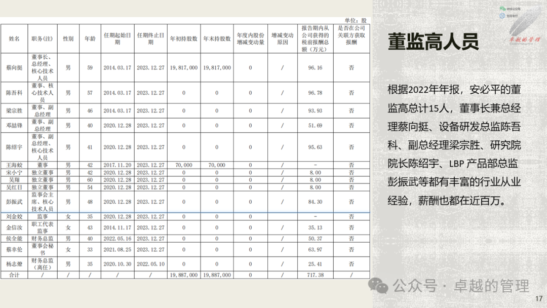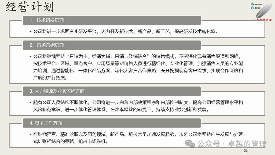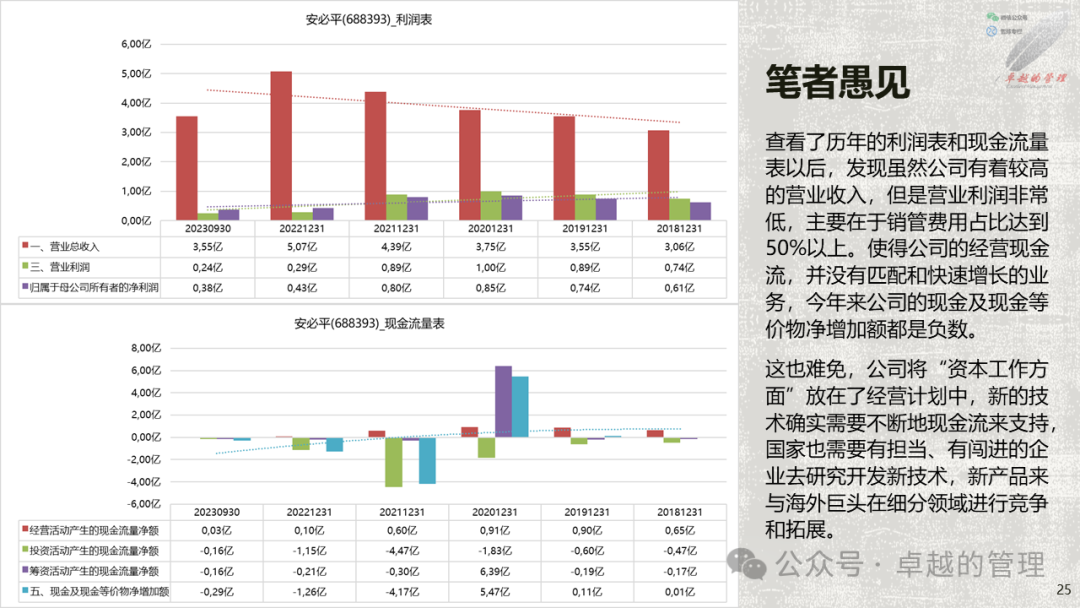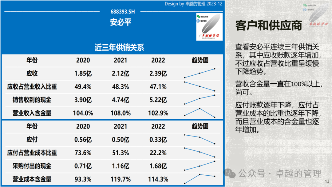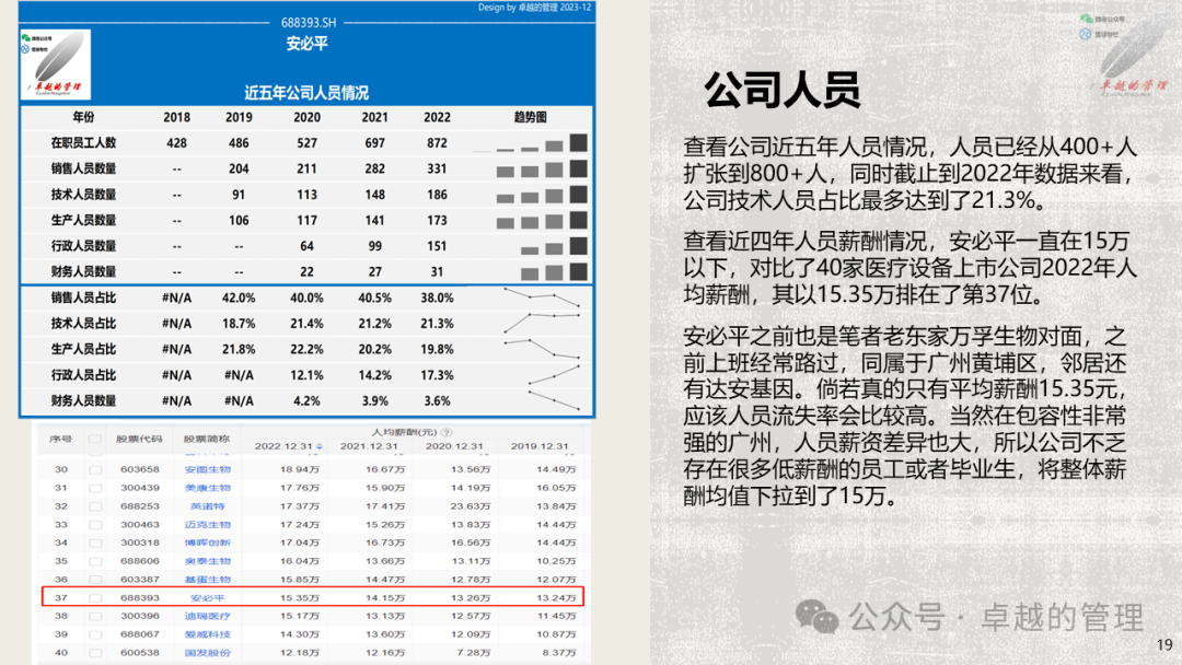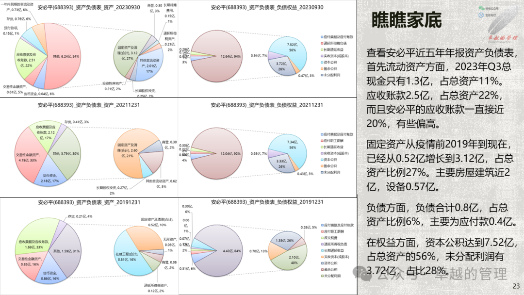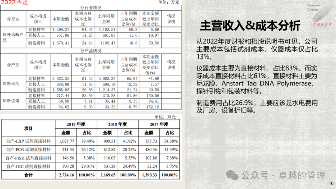 文字版 一、公司介绍 广州安必平医药科技股份有限公司(股票代码:688393)成立于2005年,是国内病理诊断领域首家上市公司,集研发、生产、市场、服务、教育五位一体,构建了肿瘤筛查、肿瘤诊断、数智病理、病理服务四大业务,服务全国2200多家医疗机构。 安必平专注于肿瘤筛查与精准诊断,围绕医院病理科“标准化、自动化、数字化、智能化”的四化建设,自主研发了常规病理、液基细胞学(LBP)、聚合酶链式反应(PCR)、免疫组织化学(IHC)、荧光原位杂交(FISH)、数字病理等技术平台的配套设备、试剂耗材,注册/备案产品数量超700个,是国内病理产品线最齐全、最丰富的企业之一。 安必平积极响应国家政策号召,为解决病理行业人才匮乏、基层医院病理能力薄弱、降低大病医疗成本的等发展难题,充分利用在病理诊断领域的深厚积累,以“产品+服务”的双轮驱动模式,在夯实技术积累、加强产品创新的基础上,拓展了数字化智能化病理科建设、病理科能力提升、药企伴随诊断三大战略业务,用实际行动推动病理行业高质量发展。 安必平始终坚持“为社会和客户创造价值,以实现员工和企业价值”,致力于成为病理诊断领域的领先企业,用精准医学诊断造福社会。 (1)肿瘤筛查与诊断试剂与设备 公司自主研发了一系列肿瘤筛查及诊断试剂与配套设备,主要应用科室为病理科。已搭建液基细胞学(LBP)、聚合酶链式反应(PCR)、免疫组织化学(IHC)和荧光原位杂交(FISH)、数字病理等系列产品线,较为完整地覆盖从细胞形态到蛋白表达、基因检测等不同诊断层次的临床需求,截止报告期末,开发出 700 余个病理诊断相关注册/备案产品,可用于多类肿瘤的筛查及诊断,系国内肿瘤筛查及诊断行业内技术平台最丰富、产品种类最多的企业之一。 (2)数字病理产品 为提升病理科“四化”水平(自动化、标准化、数字化与智能化),公司推出一系列数字病理产品:将互联网、大数据、云计算等前沿技术与已有的成熟产品相融合,开发出“实视”实时镜下视野共享系统和“爱病理”病理医生社区 APP。 (3)病理服务 为积极响应国家优质医疗资源下沉、推进分级诊疗的政策,全面提升基层医院病理科诊断能力、公司积极利用第三方独立医学检验所和病理诊断中心资质,参与各地医联体、专科联盟建设。 二、核心竞争力分析 1. 肿瘤筛查:提供宫颈癌筛查智能化整体解决方案 公司已完整覆盖细胞学检查和 HPV 检查两大宫颈癌筛查方法,是国内少数具有联检解决方案的公司,在病理科市场实践中受到临床医生推荐。在细胞病理层面,公司的液基细胞学产品采用液基薄层细胞检测系统检测宫颈细胞并进行细胞学诊断,与传统的宫颈刮片、巴氏涂片检查相比明显提高了标本的满意度及宫颈异常细胞检出率。在分子病理层面,公司的 HPV 荧光 18 型可以一管扩增《人乳头瘤病毒(HPV)核酸检测及基因分型试剂技术审查指导原则》规定的 HPV 型别。 2. 肿瘤诊断:提供细胞、分子、蛋白等多技术平台产品 病理诊断作为肿瘤诊断的“金标准”,需要从形态、免疫、分子等多个层面来对肿瘤的良恶性、亚型鉴别、靶向药物、预后判断等作出精准评估,方能对肿瘤进行精准治疗。公司同时拥有细胞学诊断、免疫诊断和分子诊断等技术平台,掌握液基细胞学(LBP)、聚合酶链式反应(PCR)、荧光原位杂交(FISH)和免疫组织化学(IHC)等核心技术,在诊断技术的多样性和全面性方面,与同行业其他企业相比均具有明显优势。 3. 持续加大研发投入,掌握核心技术 4. 深耕病理科室 18 年,产品及服务得到广泛认可 5. 病理服务形式不断创新 6. 病理+人工智能先发优势 三、主营收入&成本分析 2023年上半年安必平实现营业收入2.11亿元,较上年同期下降 13%。 从历年年报和招股说明书上可以看出,公司在总收入是在稳定地逐步增长的,只是2023年业绩快报显示营收4.97亿,同比微降1.9%。 从产品结构来看,安必平的主要营收来源自产的LBP试剂和PCR试剂,其二占比近八成。 从2022年度财报和招股说明书可见,公司主要成本包括试剂成本,仪器成本仅占比13%。 仪器成本主要为直接材料,占比83%。而实际成本直接材料占比61%,直接材料主要为尼龙膜、Anstart Taq DNA Polymerase、探针引物和包装材料等。 制造费用占比26.9%,主要应该是水电费用及厂房、设备折旧等。 从2023年中报数据来件,安必平的整体销售毛利率达到71.8%。 查看公司招股说明书,2019年及之前,公司的毛利率一直在83%左右。而且自产产品的毛利率高达近87%以上。其中最主要的LBP试剂毛利率87.5%,而分子产品毛利率都在90%以上,整体毛利率贡献47%。 其中IHC产品和自产仪器毛利率仅为54%左右,毛利率最低的是外购产品,仅为44%。 四、客户和供应商 查看安必平连续三年供销关系,其中应收账款逐年增加,不过应收占营收比重呈缓慢下降趋势。 营收含金量一直在100%以上,尚可。 应付账款逐年下降,应付占营业成本的比重也逐年下降,而且营业成本的含金量也逐年增加。 五、研发与销管财费用 2023年中期,公司研发投入3,299.98万元,占公司营业收入15.64%,同比增长5.51%。 不断加大对数字化、智能化产品以及伴随诊断业务的研发投入,宫颈细胞学AI、免疫组化(IHC)、伴随诊断、荧光原位杂交(FISH)等均有产品在进行三类证注册申报。 查看近五年研发投入与三费情况,公司研发投入从之前的1千万一年到如今近7千