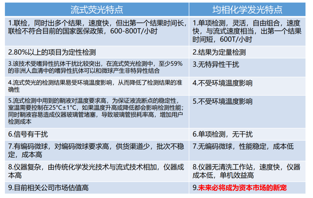 如果现在给你一个更有诱惑力的方法学,你会怎么选? 均相发光最大的优势是什么?不需要磁珠啊,磁珠成本在发光里面的成本占比有多高,大家都是知道的,无需磁珠,意味着成本可以大幅下降,这不正好符合当下的形势。 第二:磁分离,清洗,分离,清洗这些都会加大仪器的体积还有结构,意味着仪器的成本也会增加,虽然发光都是免费投,十几万的成本还是要的,当下降价情况之下,仪器回收是未来需要面临的挑战,均相的仪器比较简单,也免维护。 第三:出海成为了行业的主基调,运输成本在出海中的成本占比也很高,虽然由代理商那边出,但是性价比高,物流成本低,现在海外的代理商也需要考虑,因为是均相的,试剂组分也比较简单,可以实现试剂冻干,方便运输和出海。 第四:通过调整发光微球里的荧光染料,可以获得不同发光波长的发光微球,从而实现多指标联检。