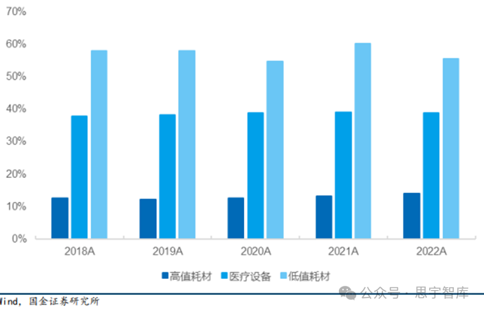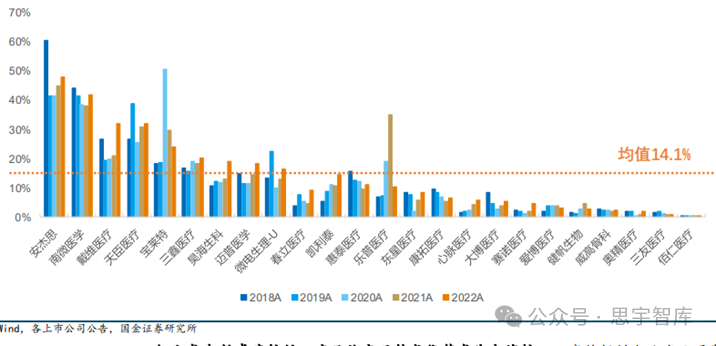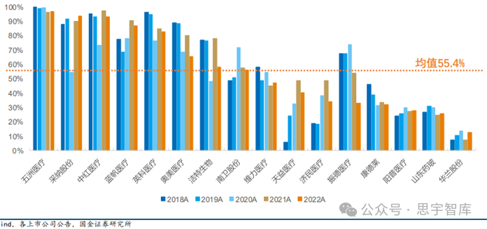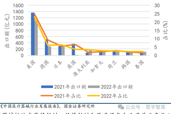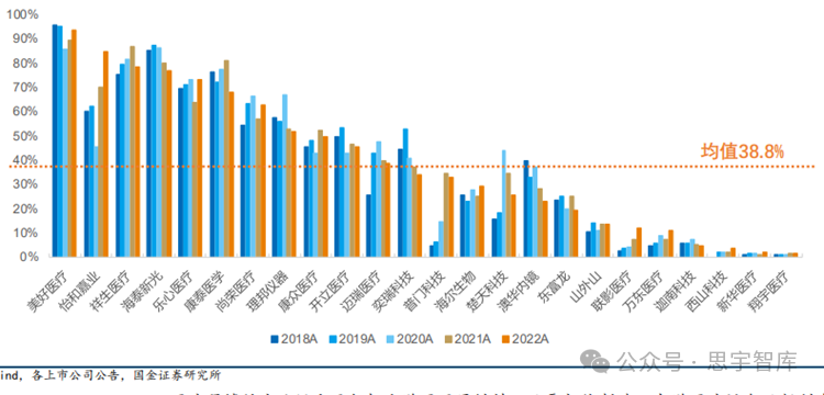 在海外区域选择方面,我国企业通常会优先选择医疗水平相对较高,医疗设备市场规模庞大的国家,如美国、欧洲、日本、澳大利亚等。据《中国医疗器械行业发展报告》数据,2022年美国仍为中国最大的医疗器械出口市场,2022年美国出口额1115.51亿元,占比23.18%。综合来看,我国对传统出口市场的出口额及占比出现下滑,对亚洲国家的出口额及出口占比逐步提升。图:2021-2022中国医疗器械出口不同国家金额及占比(来自海关总署)总体来说,类目上,医疗器械三大板块企业海外业务收入占比,低值耗材>医疗设备>高值设备。2022 年低值耗材海外业务收入占比平均为 55.4%,医疗设备达到 38.8%,高值耗材则为 14.1%。此数据的高低基本说明了不同赛道出海的难易程度,最容易且最早出海的是低值耗材,其次是医疗设备,而高值耗材目前整体仍处于出海的起步阶段。图:A股医疗器械板块各赛道海外收入占比(来自Wind)目前,我国已成为全球大规模生产制造中心,低值耗材是我国医疗器械出口的核心领域。国内低值耗材上市公司供应产品主要包括一次性医用手套、注射器、穿刺针、医用敷料、 医用导管、医用玻瓶等产品,根据2022年年报披露的海外业务平均占比达到 55.4%。图:A 股低值耗材企业海外业务收入占比(来自Wind)根据2022年年报披露的高值耗材上市公司海外业务收入,平均占比达到14.1%,大量公司海外业务仍处于起步阶段。目前我国出海成功企业稀缺,产品临床优势及渠道布局缺一不可。高值耗材出海较为困难的关键原因在于产品研发与销售模式存在较大差异。图:A股部分高值耗材企业海外业务收入占比(来自Wind)医疗设备出海的推动因素主要在产品力以及制造端,国产企业在监护仪、家用呼吸机、基础超声等领域具备较强的竞争力,另外高性价比的产品特点受到大量发展中国家的青睐,上游部分核心设备组件也获得了大量代工订单。根据2022年年报披露的医疗设备企业海外业务平均占比达到 38.8%,其中部分企业已形成较为成熟的海外销售体系。图:A 股部分医疗设备企业海外业务收入占比(来自Wind)持续技术创新:加大研发投入,掌握核心技术,提高产品质量和竞争力。合作与并购加速技术成果转化,推动产业升级。国际标准接轨:加强与国际标准的接轨,包括产品、服务、管理等方面。获得ISO认证、CE认证、FDA批准,增强国际信誉度。市场策略多元化:发展直销、售后服务网络,提升品牌形象。利用电子商务平台,拓展线上市场。法律法规适应与文化交流:深入了解目标市场的法律法规,尊重当地文化习俗。增强跨文化沟通能力,提升海外运营。经过数十年的发展,中国医疗器械行业在"出海"的征途上取得了显著成就,从原初的模仿学习到如今的创新引领,中国企业正在全球医疗器械市场中书写新的篇章。在历史的现状中,我们看到了中国品牌的崛起、技术的突破以及市场的拓展。展望未来,随着国际化步伐的加快,中国医疗器械企业将面临更为复杂多变的全球市场环境。在这一过程中,企业需要不断提升自身的创新能力、市场适应能力和国际化运营能力,同时积极应对国际贸易壁垒和监管挑战。只有这样,中国医疗器械才能在全球市场中稳固其地位,实现从追赶者到领跑者的转变,为人类健康事业作出更大贡献。