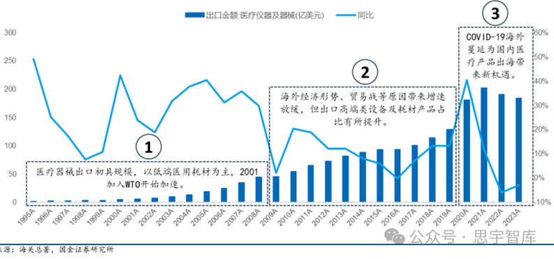 随着国内市场的竞争日益激烈,中国医疗器械企业开始将眼光投向国际市场,这标志着一个新的历史时期的开端——中国医疗器械的"出海"时代。本文将探讨中国医疗器械行业走向国际市场的历史脉络,分析其当前的发展状况,并展望其未来的发展趋势。从早期的低端产品出口到现在的高端技术和品牌输出,中国医疗器械的国际化之路既充满机遇也充满挑战。在此过程中,政策引导、技术革新、市场策略、国际合作等多方面因素共同作用,塑造了这一产业的独特发展路径。根据海关总署的数据,2023年中国医疗仪器及器械出口金额达到184.18亿美元,回顾过去中国医疗器械出口的发展历程可以分为3个阶段: 第一阶段(1995年-2008年):出口开始初具规模,2001年中国加入WTO后增速开始加速;这一阶段中国出口的主要产品以劳动密集型的低端医用耗材为主。第二阶段(2009年-2019年):在经历2008年的经济危机后海外需求增长开始出现乏力, 同时低端产品面临全球竞争加剧及国内生产成本上升等问题,增速略有放缓,但这一阶段具备一定技术壁垒的设备及耗材产品出口占比开始增加。第三阶段(2020年-至今):在 COVID-19 席卷全球后,2020-2021年中国成为全球为数不多的医疗产品正常生产供应的地区,为企业大规模出海及品牌力塑造打下了较好基础, 2022-2023年逐步回归到正常水平。