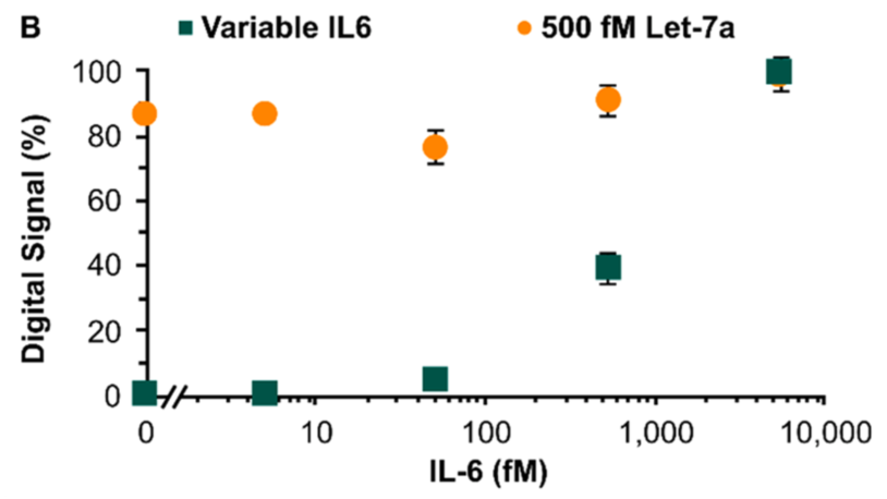 在本篇研究中,作者开发了基于微流控数字定量PCR (dqPCR)系统,通过使用单一的生物化学检测方法,在多重检测中同时定量miRNA和蛋白靶标。这种简化的分析是通过在微流控阵列平台中整合碱基堆叠PCR和免疫PCR实现的。let-7a (miRNA)和IL-6(蛋白质)的分析首先分别进行了优化,以确定适合这两种生物分子的热循环和捕获条件。单重dqPCR研究显示了两种分析物在一定浓度范围内的预期数字信号和定量循环。然后,仅使用标准PCR试剂,对let-7a和IL-6进行了高灵敏度(LODs ~ 3 fM)、宽动态范围(5 ~ 5000 fM)的多重分析。然后将该多重dqPCR转化到HEK293细胞裂解液的分析中,在不进行样品纯化或预处理的情况下,同时检测内源性let-7a和IL-6[1]。