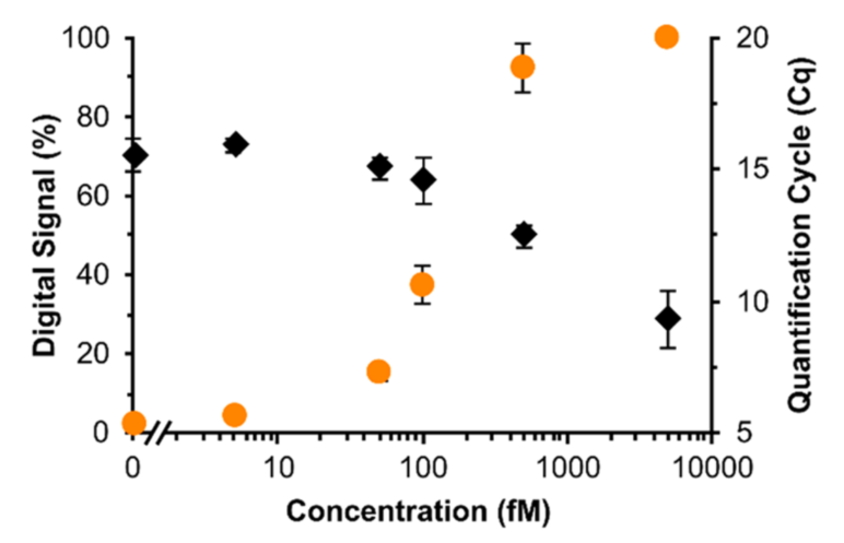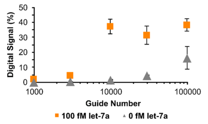 通过优化捕获缓冲液、温度和引导数,我们试图表征BS-dqPCR定量miRNA的能力。Let-7a与磁珠孵育1 h,浓度范围为0 ~ 5000 fM。较低的miRNA浓度产生数字信号,表明在单分子状态下工作,而较高的浓度使数字阵列饱和,因为所有微孔都变得活跃。唯一的限制是5 fM校准标准与空白使用这1小时捕捉时间是不可区分的。然后使用2 h捕获生成第二校准曲线以提高灵敏度(下图橙色圆形)。