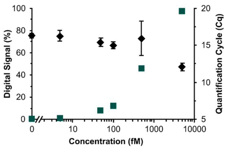 有趣的是,更高的灵敏度导至500fM信号的数字信号饱和,与5000fM校准标准无法区分。通过引入qPCR来克服dPCR信号的饱和情况(下图黑色菱形)。这些结果表明,1小时和2小时捕获均为miRNA分析提供了定量浓度依赖性反应,并且根据所需的敏感性,这两种时间均可用于后续研究。此外,通过采用dPCR和qPCR两个维度,可以扩大检测的动态范围。