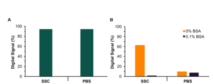 首先评估的是样品孵育缓冲液。核酸检测通常将目标分析物与SSC缓冲液中的探针杂交,以减少核酸之间的静电排斥。相反,蛋白质测定通常使用含有低百分比BSA的PBS缓冲液,以减少非特异性结合。初步的dqPCR实验评估了PBS, SSC和BSA如何影响let-7a和IL-6的捕获。之前的工作中开发了采用冷-长启动的不对称PCR热循环程序,该程序在本研究中用于蛋白质和miRNA靶点。对IL-6的分析发现,缓冲液的选择不影响测定,因为数字信号在不同条件下是一致的,下图A;然而,当在PBS中孵育时,Let-7a捕获显示出数字信号的大幅减少,下图1B。BSA的加入加剧了上述问题,因为信号进一步降低。因此,所有后续实验均使用1× SSC/0.1% Tween 20(反应体系对miRNA和蛋白同时定量检测至关重要),而不使用BSA作为捕获缓冲液。