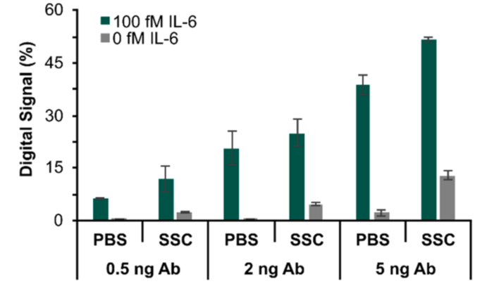 通过实验确定了最佳的检测抗体浓度和洗涤缓冲液组成。为了保持与miRNA分析维度的兼容性,阳性对照(100 fM IL-6)和阴性对照(0 fM IL-6)在1× SSC/0.1% Tween 20中在35℃孵育。在初始孵育后,在25℃下,将不同浓度的检测抗体分别与1× SSC/0.1% Tween 20或1× PBS/0.1% Tween 20/ 0.1% BSA孵育。在SSC中孵育的珠子用5× SSC/0.1% Tween 20洗涤,在PBS中孵育的珠子用5× PBS/0.1% Tween 20洗涤。本研究结果表明,阳性和阴性对照的数字信号均随着检测抗体浓度的增加而增加。
