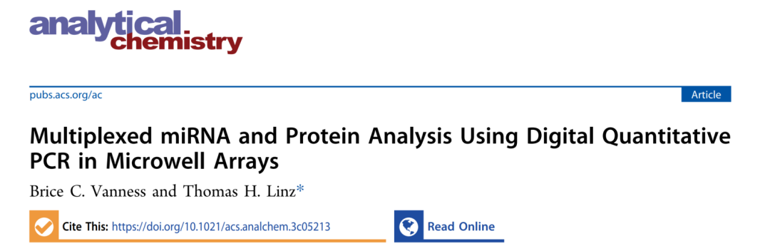 [1] Vanness BC, Linz TH. Multiplexed miRNA and Protein Analysis Using Digital Quantitative PCR in Microwell Arrays. Anal Chem. 2024 Jan 23;96(3):1371-1379. doi: 10.1021/acs.analchem.3c05213. Epub 2024 Jan 6. PMID: 38183281.