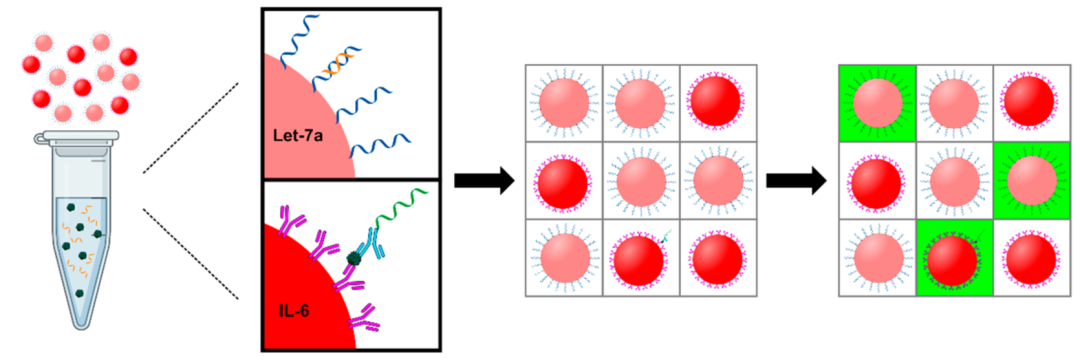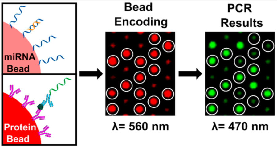 miRNA分析珠(淡红色)用guides DNA(蓝色)预先功能化。从样本中捕获目标miRNA(橙色)并作为BS-dqPCR的模板。通过编码染料(红色)和捕获抗体(紫色)对蛋白质分析微球进行预功能化。将目标蛋白(深绿色)捕获到微球上,然后用二抗(浅蓝色)标记,二抗与适合免疫- dqPCR的DNA标签(淡绿色)结合。两种捕获微球混合与生物样本孵育,然后随机载入微孔阵列中。同时进行BS-dqPCR和免疫- dqPCR,采用单一检测生产化学方法分别检测目标miRNA和蛋白。最初含有目标分析物的微孔在PCR后显示出高荧光(明亮的绿色)。