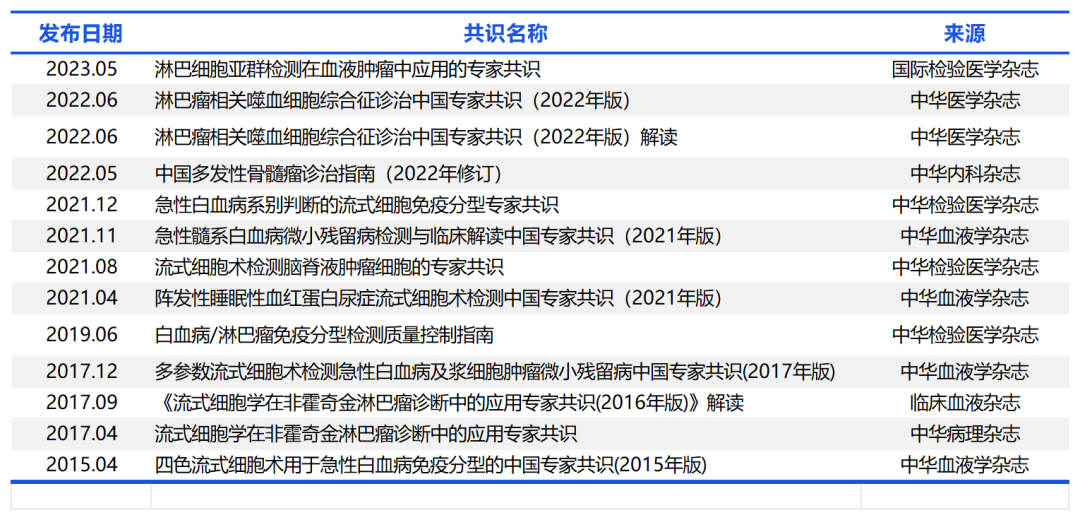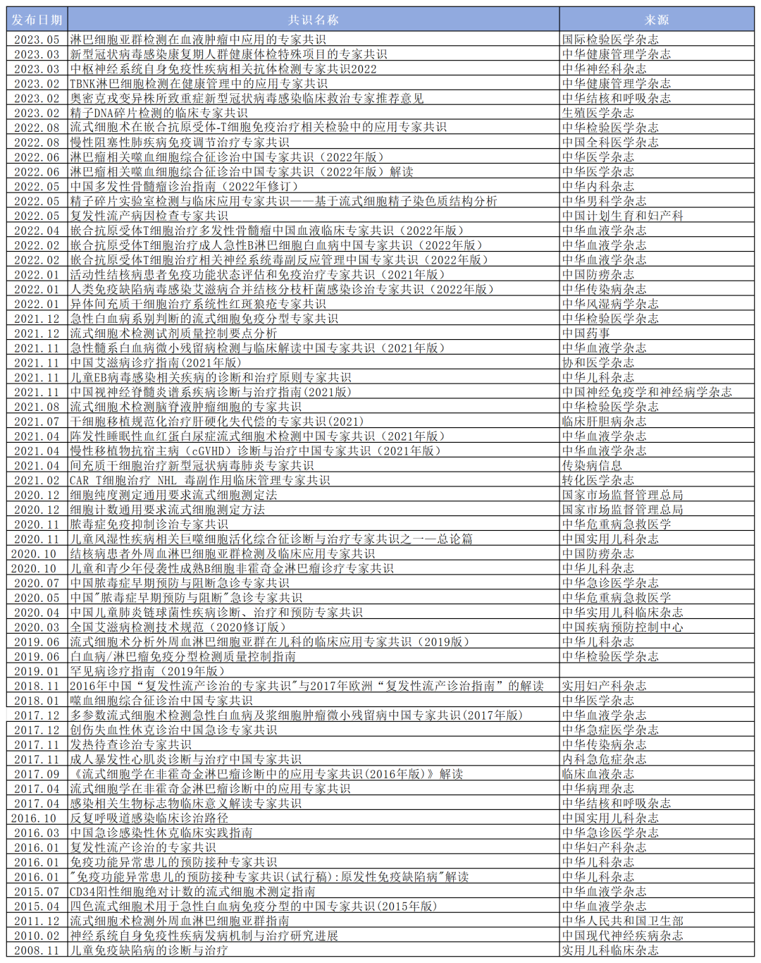 导读 随着流式细胞术的持续深化与日趋成熟,它已经在众多医学检测项目中崭露头角并取得举足轻重的地位。目前流式细胞术在临床检验中的应用范围广泛,主要涉及淋巴细胞亚群、细胞因子、造血干细胞计数、免疫分型、血液肿瘤微小残留等多个领域,为临床诊断、治疗和监测提供了便捷、高效且可靠的新辅助手段。在血液系统疾病诊断和免疫表型分析领域,流式细胞术的应用尤为显著,始终占据着重要的地位,因此,它已成为临床医学领域不可或缺的核心技术之一。 与此同时,相关的临床实践指南(简称“指南”)和专家共识(简称“共识”)的数量随着流式细胞术的飞速发展也不断增长,其关注度日益上升。本文将以表格形式呈现截止至发稿日期与流式细胞术相关的临床实践指南和专家共识。 为帮助各位小伙伴阅读及共同学习,现将指南/共识按照不同的应用领域整理分类,共分为血液疾病和肿瘤、自身免疫、传染性疾病、辅助生殖、儿科疾病、危重急症、细胞治疗和健康管理。 血液疾病和肿瘤篇 2023年国内首部血液肿瘤患者患者淋巴细胞亚群检测专家共识,首次将流式细胞术检测的TBNK和Treg结合起来从而评估患者的免疫功能。归纳并总结两个流式检测项目对于血液肿瘤筛查、复发转移预警及预后评估等给出相关监测方案。 此外FCM在微小残留白血病检测也有重要作用。MRL是白血病复发的根源,因此检测MRL有十分重要的意义: ①指导临床治疗②预测白血病复发③评价自体骨髓移植的净化效果。 自身免疫篇 自身免疫性疾病的显著活动大部分与浆母细胞及短寿浆细胞所分泌的抗体相关。通过使用流式细胞仪对患者外周血中的浆细胞及其表面免疫标志进行分析,对于疾病的诊断、预后预测以及治疗监测均具有一定的指导意义。如外周血浆母细胞水平和系统性红斑狼疮病情变化有良好的相关性。FCM还可以预测和评估靶向药物疗效和疾病复发评估。 中枢神经系统自身免疫性疾病是以自身免疫细胞、自身抗体及其他免疫分子直接或间接攻击神经系统(包括神经元、胶质细胞、髓鞘)为主要致病机制的自身免疫性疾病。其中CNS炎性脱髓鞘疾病、自身免疫性脑炎(AE)是较为常见的中枢神经系统自身免疫性疾病,这一类疾病的早期鉴别诊断、疾病进展监测以及疗效预后评估等很大程度上依赖于实验室辅助检查。在2023年发布的《中枢神经系统自身免疫性疾病相关抗体检测专家共识2022》中就提到相关抗体的检测建议采用CBA的方法进行检测,其敏感度和特异性远高于酶联免疫吸附测定法和间接免疫荧光法。 传染性疾病篇 艾滋病,即获得性免疫缺陷综合征,其病原体为人类免疫缺陷病毒,亦称艾滋病病毒。AIDS 是影响公众健康的重要公共卫生问题之一。CD4+ T 淋巴细胞是 HIV 感染最主要的靶细胞,HIV感染人体后,出现 CD4+ T 淋巴细胞进行性减少, CD4+ /CD8+ T 淋巴细胞比值倒置,细胞免疫功能受损。目前 CD4+T 淋巴细胞亚群常用的检测方法为流式细胞术,可直接获得 CD4+ T 淋巴细胞数绝对值,或通过白细胞分类计数后换算为 CD4+ T 淋巴细胞绝对数。CD4+T 淋巴细胞计数的临床意义: 了解机体免疫状态和病程进展、确定疾病分期、判断治疗效果和HIV 感染者的并发症。 结核病是严重危害人类健康的慢性传染病,但结核病不仅是一种细菌感染性疾病,也是一种免疫性疾病,其发生、发展及转归与机体的抗结核免疫功能状态密切相关。其中,机体固有免疫和适应性免疫发挥了重要的抗结核作用。固有免疫细胞主要包括单核细胞、巨噬细胞、NK细胞等;其在抵抗MTB侵袭,清除巨噬细胞内的MTB方面发挥抗结核防御作用。适应性免疫中,T细胞(包括CD4+和CD8+细胞)介导的细胞免疫应答及其产生的 Th1型细胞因子(如IFN-γ和IL-2)发挥主要的抗结核作用;而B细胞和抗体介导的体液免疫应答发挥辅助的抗结核作用。因此,通过检测结核病患者免疫细胞的数量和免疫功能,评价其免疫功能状态,可为临床制定免疫干预措施提供依据。 辅助生殖篇 随着现代工作生活节奏的加快,都市女性在压力下的健康问题日渐明显,包括月经失调、卵巢早衰和不孕不育等。复发性流产(RSA)是指连续两次或两次以上的自然流产,复发风险与流产次数相关。RSA的病因包括母体免疫、易栓症和生殖道解剖异常等,其中免疫因素是最重要的病因,但仍有约35-44%的RSA患者原因不明。 Treg细胞通过对抗免疫反应中的自身抗体,在免疫系统自身耐受性的维护中发挥着主导作用。当妊娠期Treg细胞缺乏时,会导至母体排斥胎儿而引发妊娠终止。FCM检测显示,RSA妇女外周血Treg细胞表达量减少,抑制能力降低。 其次,如果男方精子质量不好,受精卵质量也就不好,从而也会导至胚胎发育不良而使女方流产。因此除了对精子质量进行常规检测外还要引入一个新指标精子DNA碎片率(DFI)即断裂成单链的DNA碎片占整个精子DNA的比例。如果患者精子DNA损伤严重,不仅会影响精子的质量,造成卵子受精失败而降低怀孕几率(男性不育),而且还会影响胚胎质量,导至胚胎发育不良而形成流产。 儿童篇 PID是免疫功能不全的疾病,由先天性或遗传性因素导至。典型表现是婴儿或儿童期频繁反复发生特殊感染,常见为抗体缺陷为主的免疫缺陷病和联合免疫缺陷病。淋巴细胞亚群分析是早期诊断的重要手段,可评估免疫状态。 2019年发布的《流式细胞术分析外周血淋巴