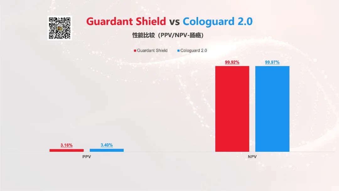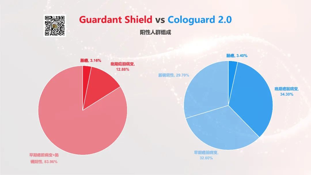 在评估一个筛查产品的时候,PPV和NPV是非常重要的指标。 按理说,大家敏感性/特异性差别明显,PPV和NPV也会拉开差距的吧? 然而,事实上二者在肠癌上的表现是这样的: 似乎,没什么差别?问题出在哪? 问题出在发病率上,ECLIPSE人群中的肠癌发病率是0.42%,BLUE-C中是0.5%,都是一个极小的发病率。 而不管NPV还是PPV,固然和敏感性/特异性挂钩,但更直接相关的是发病率。 举个例子,如果一个疾病的发病率是0.5%,那么所有早筛产品的NPV都会是至少99.5%起步。 同样是在ECLIPSE和BLUE-C中,面对发病率超过10%的晚期癌前病变(10.8%/11.1%),PPV和NPV的差距立马就拉开了。 下面这张图会看的更明显——Guardant Shield和Cologuard 2.0的阳性人群分别都是什么情况。