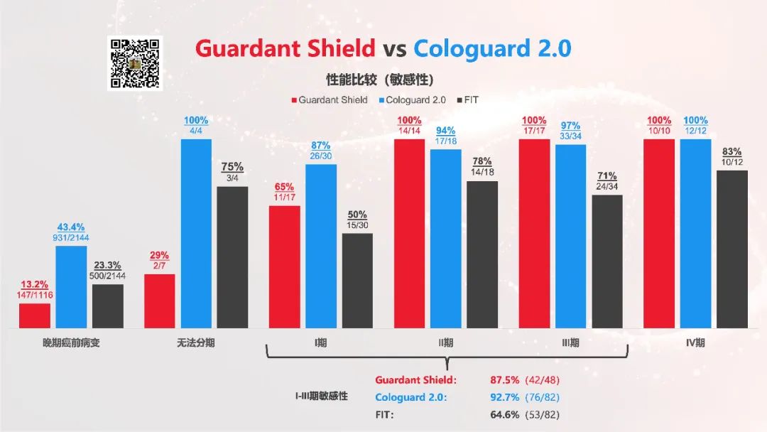 PS:本文仅代表个人观点,受限于自身的视野、阅历及认知,欢迎探讨。 01 性能详解 在两篇NEJM中,ECLIPSE和BLUE-C的统计口径是有些差异的,因此并不是所有指标都能被一一对照。 在尽可能统一口径之后,双方可比的检测性能参数如下: 整体来看,姜还是老的辣,早筛还是带FIT的香。 Cologuard 2.0的性能无疑更为漂亮: 不仅有着非常清晰的“随着分期爬坡的敏感性”,在晚期癌前病变上更是展现出了碾压性的优势(43.4% vs 13.2%)。 反观Guardant Shield,性能在跨期别之前的爬升太过陡峭且毫无过渡,看着多多少少有点“晚期过拟合”的嫌疑😂 当然,Guardant将晚期癌前病变上的拉胯表现归咎为目前基础研究的不到位。 但,这是仅有的看点吗? 02 “诡计”和“疑点” 细看这两个临床试验,里面充斥着数字的诡计和小心思。