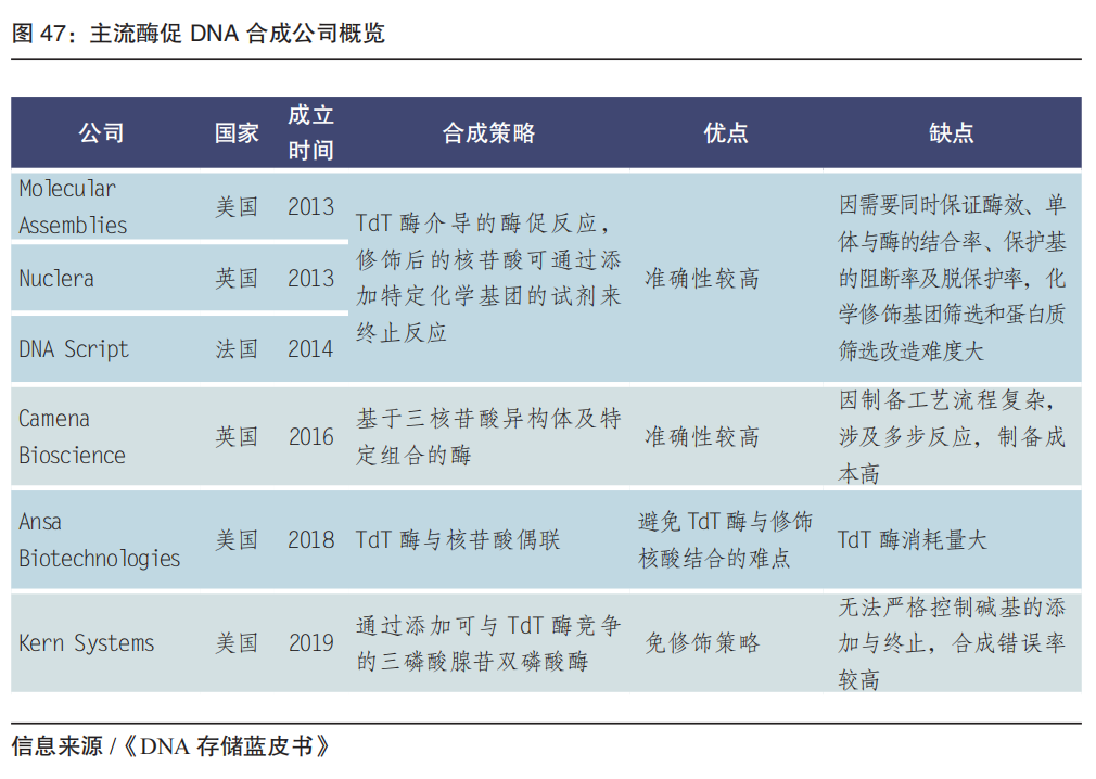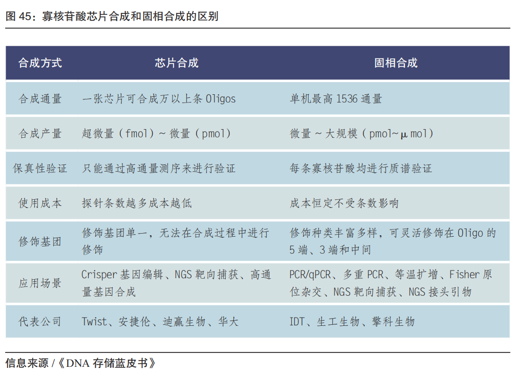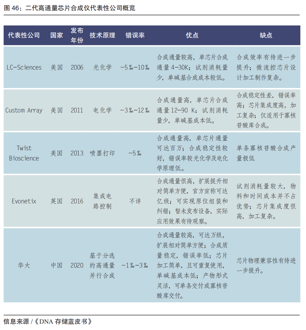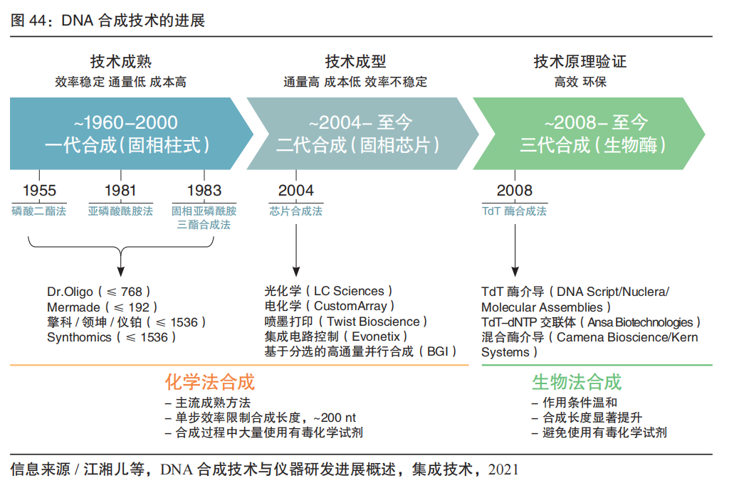 以体内基因编辑疗法为例,国内外代表企业的相关进展如下: 基因编辑的关键是底层技术及其专利。目前绝大部分基因编辑核心专利来自国外。我国大部分基因治疗企业管道是体外疗法(基于基因编辑和造血干细胞移植)。2022 年1月,国内企业辉大基因研发的 CRISPR-Cas13 RNA 编辑器系统的底层专利获美国专利局授权,是国内企业的里程碑;2023年1月,辉大基因的基因疗法 HG004(治疗 RPE65 基因突变引起的相关性视网膜病变)、嘉因生物宣布的基因疗法 EXG102-031 注射液(治疗湿性年龄相关的黄斑变性)的 IND 被 FDA 批准。 FDA 对基因治疗临床试验审核严格,除了 EDIT-101(治疗 Leber 先天性黑矇 10),对于 eli-cel 的 III 期临床试验(用于治疗脑肾上腺脑白质营养不良)也曾叫停。未来,基因编辑技术仍需进一步投入研发,在减少脱靶效应、提高同源重组效率、实现基因定点替换或插入等方面进行优化和突破。2023年,有望FDA批准首例 CRISPR 基因编辑产品。 05 合成生物核心技术 高通量基因合成及生产平台 基因合成是合成生物的底层核心技术之一。也是基因行业从“读”到真正的“写”的跨越,技术壁垒更高。目前基因合成的阶段是高通量DNA合成,包括化学合成和酶促合成两大类。 DNA合成的本质是将脱氧核苷酸单体按事先确定的顺序依次连接起来,形成短链或长链的核酸,应用于引物和探针的生产、合成生物学、基因药物研发以及DNA存储等领域。 常规DNA合成方法以单链寡核苷酸合成为基础。寡核苷酸化学合成起步于二十世纪四十年代末。1955年,剑桥大学的Todd实验室第一次用化学法成功合成了简单二聚寡核苷酸,并于1957年获得诺贝尔化学奖。 化学合成技术相对成熟。化学合成包括亚磷酰胺三酯合成法,光化学脱保护合成法、电化学合成法、氢磷酸酯合成法、两步合成法、双碱基单体合成法等。从合成的基本技术原理上来说,亚磷酰胺三酯法是目前主流的寡核苷酸化学合成的原理基础。从设备平台上,根据不同的应用场景可分为固相合成和芯片合成。 ●超微量(fmol 级)和微量(pmol 级):用于CRISPR基因编辑和NGS靶向捕获等; ●常规量(nmol 级):用于常规PCR和荧光定量PCR等; ●大规模合成(μmol 级):用于医药诊断行业的工业原料。 DNA合成仪是DNA合成的核心装备。自上世纪九十年代起,英美等国基于经典化学合成法原理开始了DNA合成仪的研发与商业化,目前从第一代柱式合成仪迭代到第二代高通量芯片合成仪。 第一代柱式合成仪的合成载体为柱状管道合成柱,内部填充的可控多孔玻璃 (CPG) 为反应介质,通过电脑程序控制试剂加入与CPG反应,最终合成单链DNA。代表生产机构包括美国的GE、ABI、Beckman Coulter 等公司,德国的 K&A Laborgeraete、PolyGen等公司,韩国的Bioneer公司,丹麦的 TAG Copenhagen A/S,日本的瑞翁医疗株式会社,我国的擎科生物、领坤、仪铂等。 第二代芯片合成仪,以芯片为DNA合成载体。单张芯片可实现成千上万条长度不等的单链 DNA合成。该类型设备可在提供高通量合成的同时降低试剂的消耗,初步实现低成本高通量的寡核苷酸合成。 2022 年我国实现高通量DNA合成仪的国产化,华大mMPS-M200合成仪打破国外科技创新技术壁垒。同年,华大落地常州搭建合成生物学大平台,其产出将可达到每台机器10亿碱基/年,整体产能达千亿碱基/年,并成立常州新一产生命科技有限公司。 相对传统亚磷酰胺化学合成法的化学反应效率限制合成产物长度(200-250 nt),以及强酸、强氧化剂等环境不友好产物的处理费用高昂,近几年出现的生物酶促DNA合成技术,通常在水相环境下进行,可有效避免上述问题,有望以更低的成本合成更长的DNA分子。酶促合成代表企业有包括 Molecular Assemblies、Nuclera、DNA Script、Camena Bioscience、Ansa Biotechnologies、Kern Systems。国内市场起步较晚,2022年,中国科学院天津工业生物技术研究所研究团队利用改造获得的合成酶创建了二步循环酶促DNA合成技术。 展望未来 5~10 年,基因科技核心技术及工具的应用将有望转化到医疗、农业、工业等领域,和医疗健康、微生物工业、农业分子育种、海洋开发利用、先进制造、医疗电子信息等紧密结合,形成更多的战略性新兴产业和未来产业。 附:产业创新案例——墨卓生物 多组学、跨平台、一站式单细胞解决方案 |