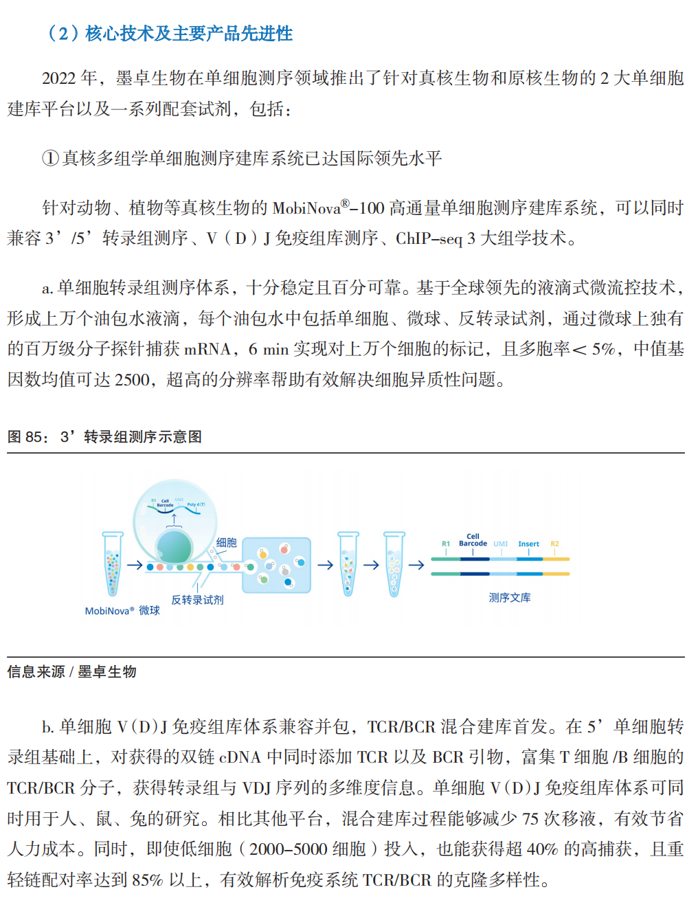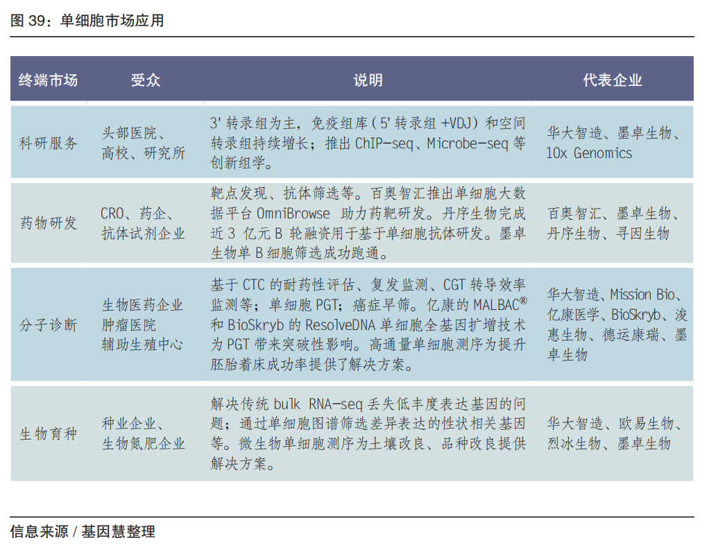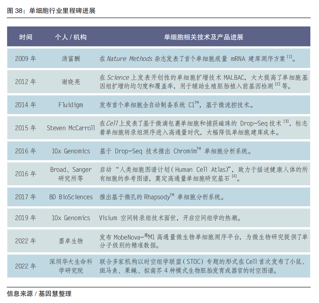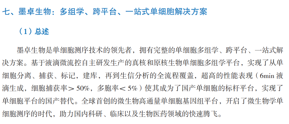 2019年起,我国单细胞分析领域开始加速发展,主要包括以百奥智汇为代表的单细胞数据库平台,以华大智造、墨卓生物为代表的单细胞捕获建库系统的国产替代,以浚惠生物为代表的单细胞图像分析和自动分离产品。其中我国具有国际影响力的成果是,华大的 Stereo-SEQ技术基于具有空间位置信息的DNA纳米球空间捕获芯片实现分辨率500nm的时空图谱;墨卓微生物单细菌平台MobiNova®-M1引领全球,开启微生物的单细胞基因组时代。 其中单细胞捕获建库系统,包括液滴法(华大智造、墨卓生物、寻因生物、万乘基因等)及微孔法(新格元、德运康瑞等)。2019年,华大智造推出口袋单细胞分析系统DNBelab C4,极大降低了单细胞研究的门槛;2022年,墨卓生物发布 MobiNova 高通量单细胞多组学解决方案,通过稳定的产品质量、ChIP-seq 为代表的创新组学,迅速在科研服务市场形成替代。 单细胞的技术、产品正快速发展,已独立成一个规模化产业。未来可关注如下方向: