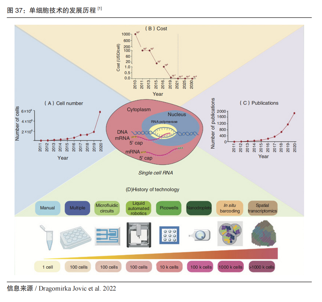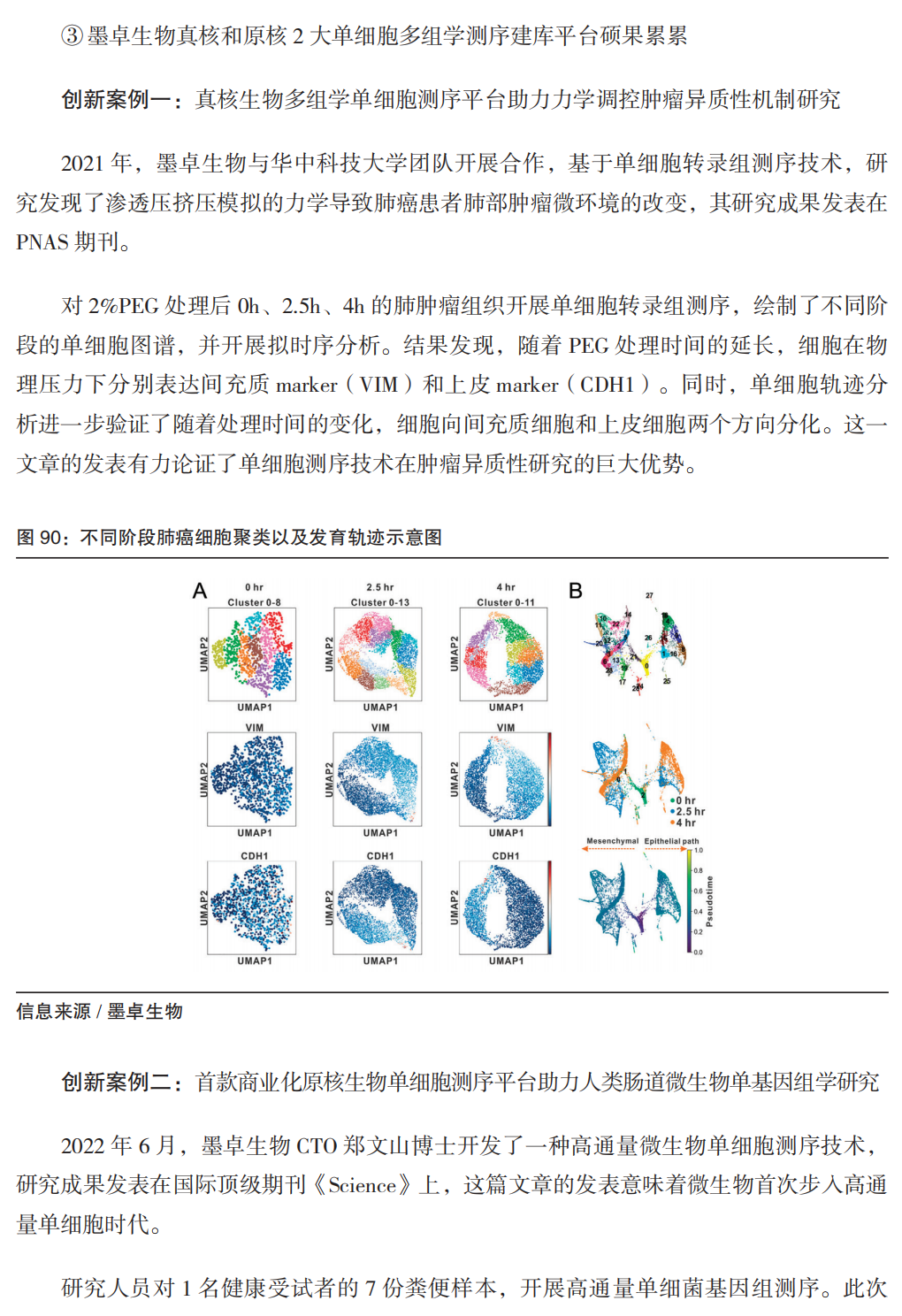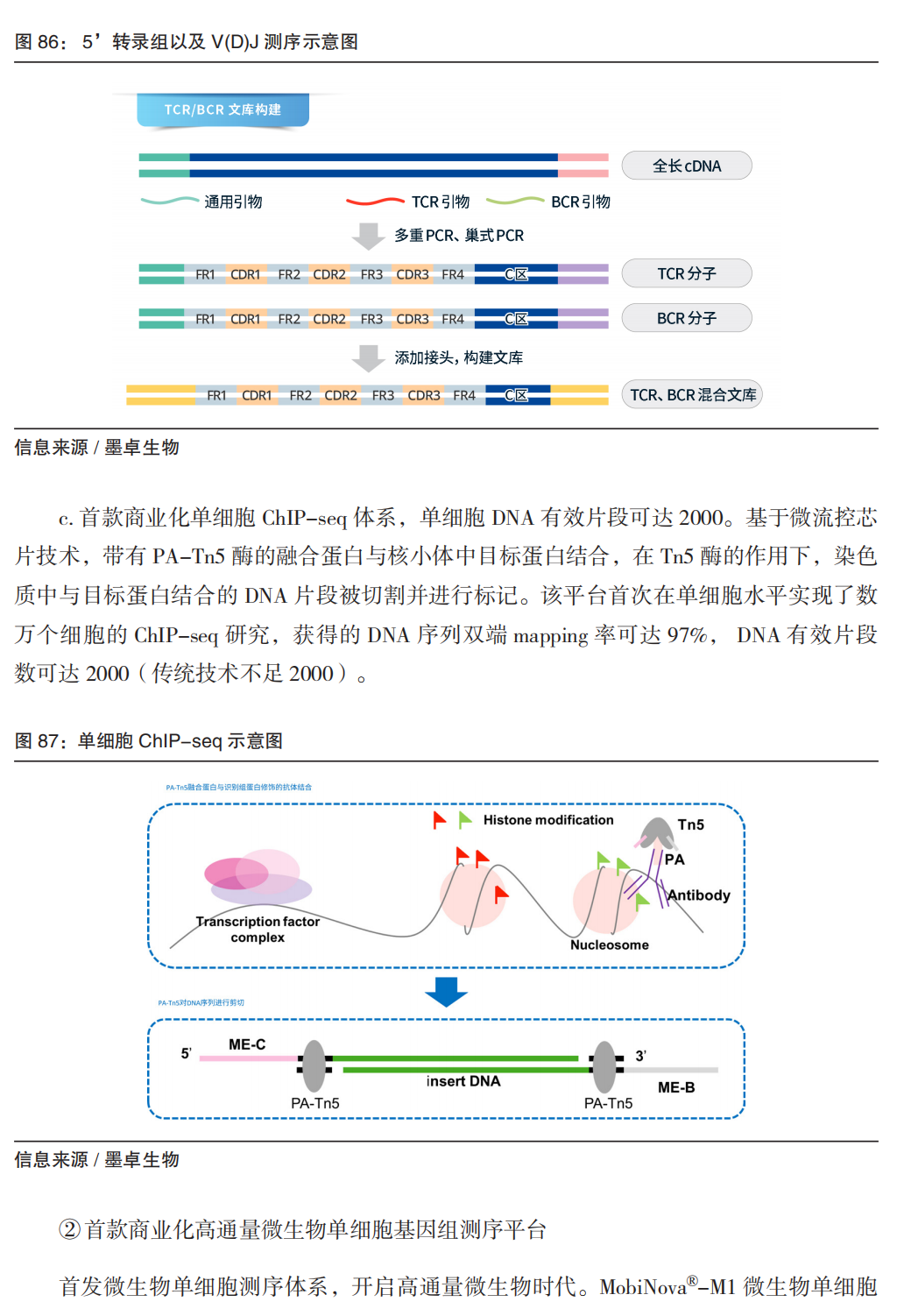 2019年起,我国单细胞分析领域开始加速发展,主要包括以百奥智汇为代表的单细胞数据库平台,以华大智造、墨卓生物为代表的单细胞捕获建库系统的国产替代,以浚惠生物为代表的单细胞图像分析和自动分离产品。其中我国具有国际影响力的成果是,华大的 Stereo-SEQ技术基于具有空间位置信息的DNA纳米球空间捕获芯片实现分辨率500nm的时空图谱;墨卓微生物单细菌平台MobiNova®-M1引领全球,开启微生物的单细胞基因组时代。 其中单细胞捕获建库系统,包括液滴法(华大智造、墨卓生物、寻因生物、万乘基因等)及微孔法(新格元、德运康瑞等)。2019年,华大智造推出口袋单细胞分析系统DNBelab C4,极大降低了单细胞研究的门槛;2022年,墨卓生物发布 MobiNova 高通量单细胞多组学解决方案,通过稳定的产品质量、ChIP-seq 为代表的创新组学,迅速在科研服务市场形成替代。 单细胞的技术、产品正快速发展,已独立成一个规模化产业。未来可关注如下方向: