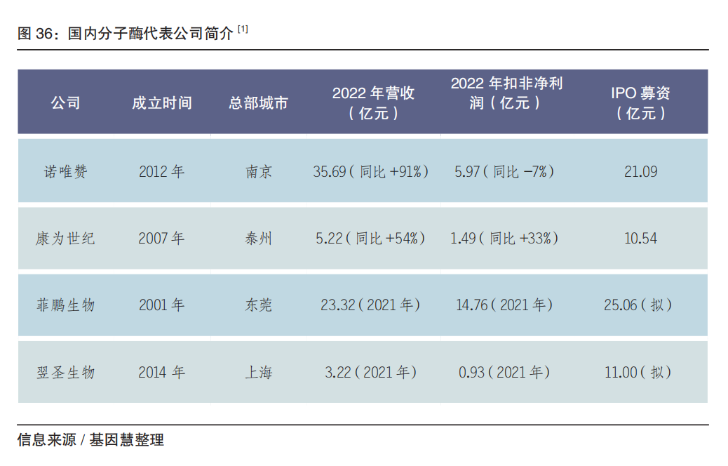 随着分子诊断近年快速发展,分子酶成为基因行业上游核心原料,广泛应用于靶向捕获、建库以及测序、合成等生产,并发展到CRISPR快速诊断等终端试剂领域。 常用分子酶包括DNA聚合酶、逆转录酶、内切酶、修饰酶、连接酶等。近年兴起的CRISPR-Cas 系统,其中的 Cas 蛋白即是核酸剪切酶。 分子酶的研发流程相对成熟,一般遵循“设计-构建-测试-学习”的过程,包括基于目标功能确立初始天然酶以及对应基因、基因克隆和表达、序列突变、构建结构功能模型、体外进行蛋白表达和纯化。这个过程需要交叉学科技术人才、环节众多、周期长,构建平台化的开发体系和生产体系的门槛高。 其中,定向进化是酶的最前沿的技术之一。2018年诺贝尔化学奖获得者之一是酶定向进化先驱Frances H. Arnold。酶定向进化包括基因突变库建立和高通量筛选两个步骤。传统的定向进化是通过易错PCR(error-prone PCR)建立庞大的突变库,然后通过平板/微孔板/流失细胞(FACS 法);最新的酶定向进化,结合序列及结构信息和计算机辅助设计。 具有代表性的分子酶机构包括罗氏诊断、安捷伦、赛默飞、沃奇酶科(Watchmaker Genomics)、诺唯赞、菲鹏生物、康为世纪、翊圣生物、爱博泰克等。 当前国内分子酶产业,随着更多厂商的涌入,国产化红利正在消失,正经历低价策略的竞争周期,面临激烈的市场竞争。从市场角度,头部企业2022年起积极布局海外市场。此外,基因合成或合成生物作为新兴市场领域;从技术角度,CRISPR快速诊断系统等新一代产品也被用于开拓高端市场。市场上比较有代表性的CRISPR快速诊断厂商(和产品)包括 Sherlock Bioscience、Proof diagnostic、吐露港生物的HOLMESv2系统、Mammoth Biosciences 的DETECTR诊断系统、为真生物的NuRapid分子检测技术平台等。 基因慧认为,在分子酶领域可以关注的方向包括: