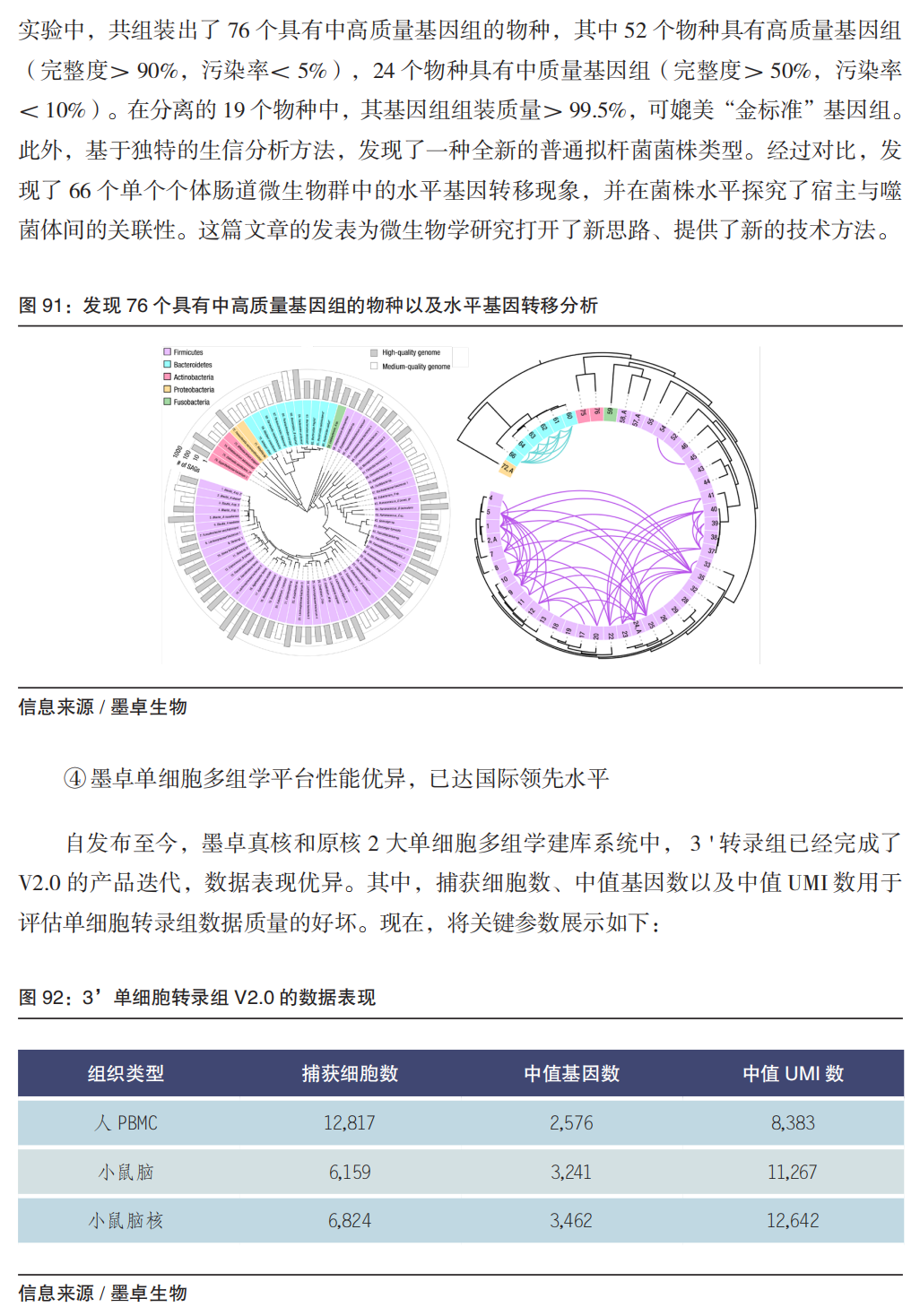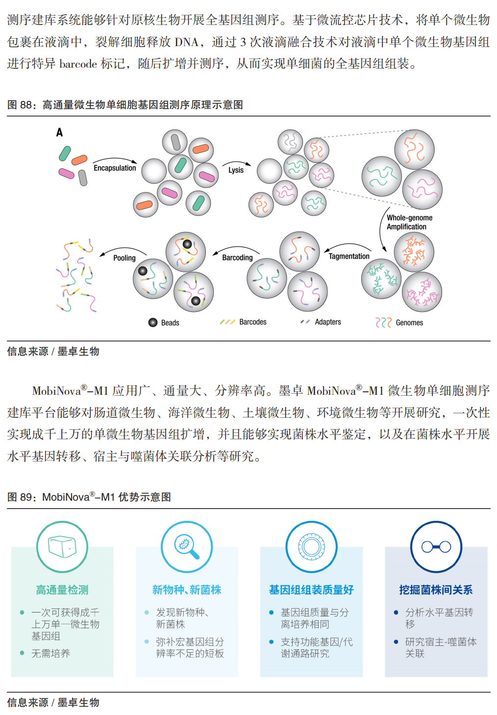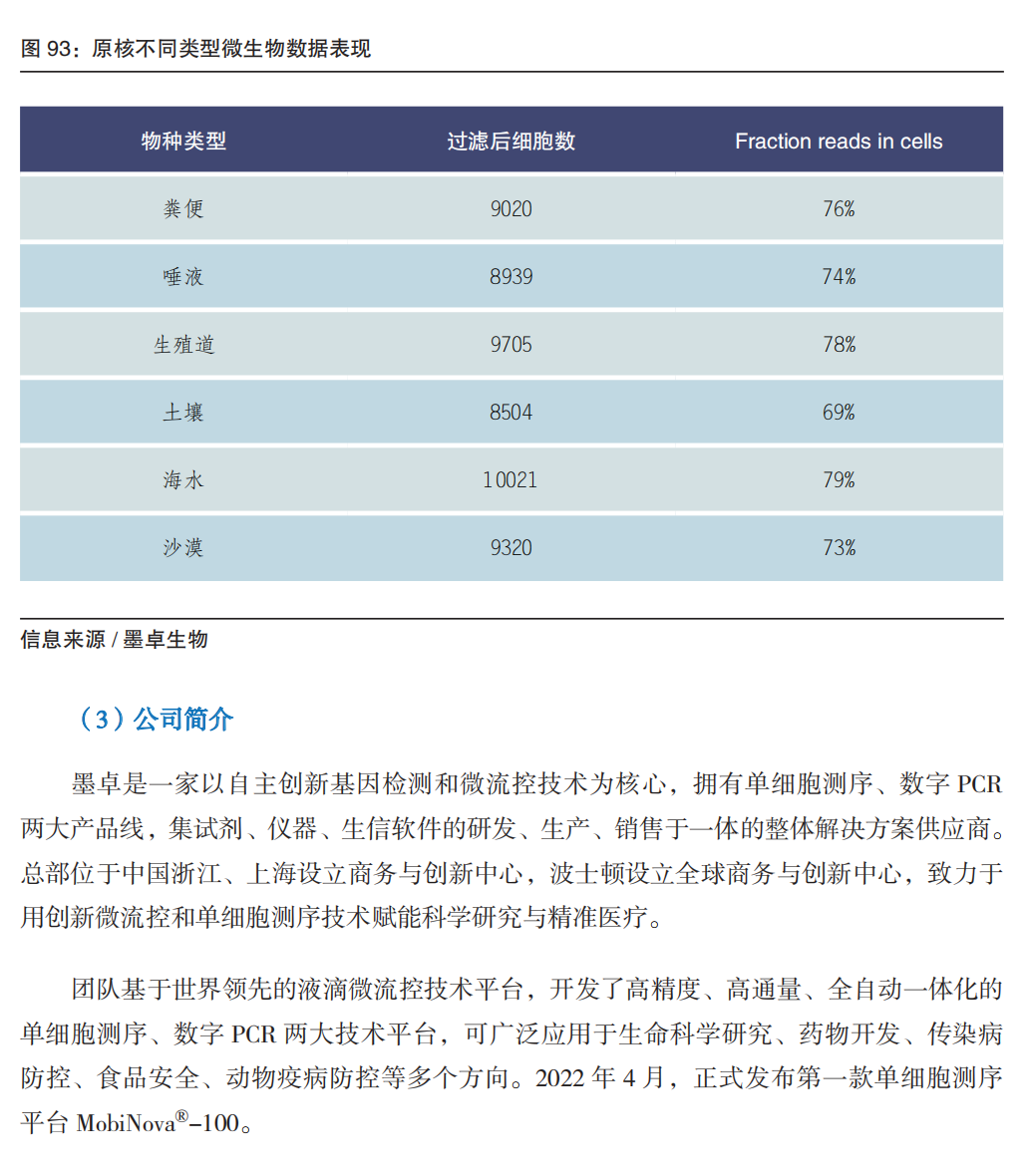 02 从单个细胞分辨率解码生命 单细胞分析系统 通常的测序技术研究细胞群体的平均特征,这无法满足个别情况下在单个细胞层面研究的需求(例如肿瘤细胞的免疫治疗反应)。单细胞分析技术在2009年前后应景出现。 单细胞分析(单细胞测序),本质上是分析单个细胞水平的序列信息,以更高分辨率揭示细胞间的异质性以及其在微环境中的反应情况,包括不同的细胞类型和细胞群的独特突变、克隆进化、信号传导、物质传递以及环境应答等。 从技术上,目前的单细胞分析是在单个细胞水平捕获,结合测序,对单细胞层面进行生物信息的获取和分析,用于基础研究以及临床诊疗、分子育种等方面应用。完整的单细胞分析(以单细胞RNA-Seq为例)通常包括五个步骤:(a)液滴法或者微孔法等捕获单个细胞;(b)提取 RNA,对反转录的 cDNA 加条形码(barcode)并扩增;(c)文库制备;(d)高通量测序;(e)生物信息分析和数据可视化。 从应用上,单细胞技术用于科技服务,应用于科研、药物、育种、合成生物等方面。 近年,微生物单细胞测序快速发展,在基础科研(微生物组)、农业生物技术(生物固氮、微生物制剂饲料等)、药物研发(菌株库、抗菌药耐药研究等)等方面提供科技服务。以墨卓生物为例,首创的 MobiMicrobe 技术将多种液滴微流控和定制的生物信息学分析集成,不需要培养即可从复杂微生物群落中获取万量级的单细胞微生物的基因组信息,并组装出高质量的菌株水平基因组。2022年,中国农业大学王涛教授、董江丽教授团队通过单细胞技术描绘不定型根瘤的单细胞转录组图谱,发现了共生固氮新机制;慕恩生物基于单细胞层面对微生物进行分离培养,拥有14万株功能菌株,5轮共计数亿元融资。 单细胞分析的难点及技术突破路线: