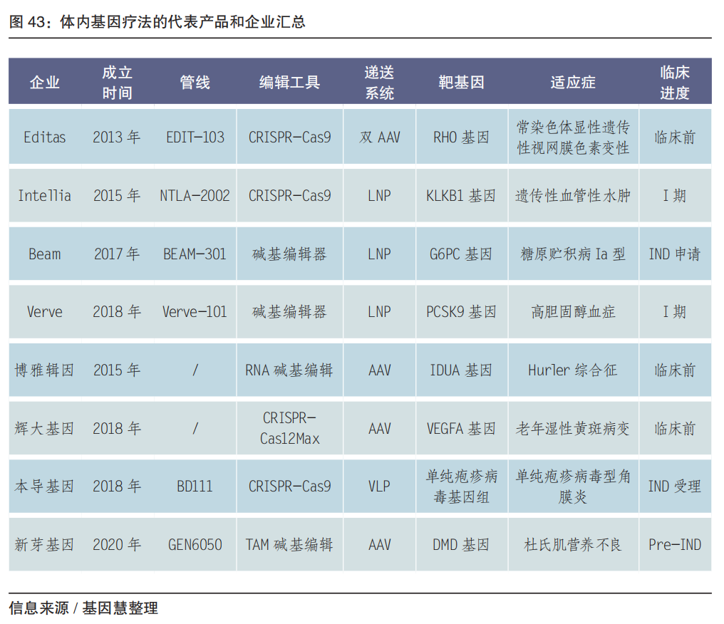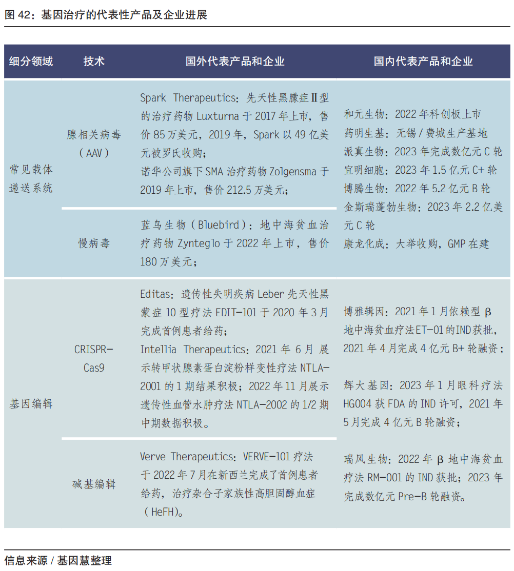 从测序原理和工具上,市面上俗称“一代”、“二代”及“三代” ;但从应用上,目前一代测序为金标准,二代测序和三代测序分别在短读长和长读长上各有优势,互为补充。 伴随制造业及国产化红利(2022年医疗设备更新改造贴息贷款2000亿),测序仪的市场估值维持高增长,可关注华大智造、齐碳科技、安序源、赛纳生物、铭毅智造等。在2022年,华大智造在国内基因测序设备市场份额 39%,测序仪收入同比增长37.74%;在2023年Q1,华大智造推出了超高通量基因测序仪DNBSEQ-T20×2,单机年产量高达5万WGS 及以上、单样本测序成本低于百美元,测序仪业务延续增长态势,整体收入同比增长12%。值得关注的是,Element Bio发布中通量、高灵活度测序仪,2022年12月正式宣布成立中国代表处(元素生物科学公司);PacBio 推出1000美 HiFi人全基因组的长读长测序系统 Revio,全年营收1.28 亿美元(同比-2%);ONT全年营收1.99 亿英镑(同比+49%),预计2023年实现MiniION自动化和RNA直接测序,2026年实现盈亏平衡。 04 基因治疗产业化核心 基因编辑及基因治疗载体 当下基因治疗产业化的核心是基因编辑技术专利及载体生产。 载体以病毒(AAV等)或质粒DNA最为常见。最常用的病毒载体包括腺相关病毒、腺病毒、逆转录病毒、慢病毒等。早在2003年,我国批准的全球首个基因治疗药物,来自深圳赛百诺公司的“今又生”即是重组人P53腺病毒注射液。病毒载体具有组织嗜性和免疫原性等问题,近年非病毒载体也在快速发展。载体生产企业可关注和元生物、药明生基、博腾生物等。 基因编辑指的是通过基因编辑技术实现目的基因的校正、敲除和增加,起步于20世纪末,从锌指核酸酶(ZFN)、转录激活子样效应因子核酸酶(TALEN)、CRISPR-Cas9(2012年)发展到前沿的碱基编辑技术(2016年)等。 CRISPR-Cas9 的本质是基于一个短的回文序列 CRISPR RNA 特征,利用 Cas9 蛋白来识别、结合和切割靶向的 DNA。2020年诺贝尔化学奖授予 CRISPR-Cas9 的研究者加州大学伯克利分校生物化学家Jennifer Doudna;同时,2022年2月,美国专利和商标局(USPTO)判定来自哈佛大学和麻省理工学院博德研究所(Broad Institute)的张锋团队拥有在真核细胞中使用 CRISPR 的专利。未来仍需进一步克服脱靶现象,提高 Cas9 蛋白活性以及传递有效性。 为了解决在基因编辑过程中更准确地找到靶点,完成精确的切割和精准的编辑,2016年,基因编辑领域的另一位KOL——来自哈佛大学的David Liu发明了单碱基编辑器(Base Editor),提升了基因编辑效率,降低了脱靶效应,并且持续更新,从胞嘧啶碱基编辑器(CBE,将CG 转换为TA)、腺嘌呤碱基编辑器(ABE,AT转换为GC)到 CGBE 编辑器(CG转换为GC)。Jennifer Doudna、张峰、David Liu 分别创建了 Intellia、Editas、Beam 等企业。 基因治疗企业聚焦两大类业务,分别是载体工厂的研发生产外包(CDMO)或生物技术公司的实验室服务(基因编辑技术研发及临床前研发等)。 载体的 CDMO 的关键因素是资本。头部机构通过上市、融资、进而收购等扩大产能的方式来抢占市场高地。康龙化成以收购开启和加速 CGT(细胞和基因治疗)业务板块建设,2020 年起先后收购美国的Absorption Systems、英国的 Allergan Biologics Limited(艾伯维旗下)和英国的 Pharmaron Biologics(UK) 等企业,建立近70000平方米GMP,预计2023年开始承接项目。 传统的CRISPR系统存在编辑效率与精准度的局限,因为体积过大也缺乏合适的递送载体。近年,碱基编辑器等新型基因编辑工具被陆续开发。