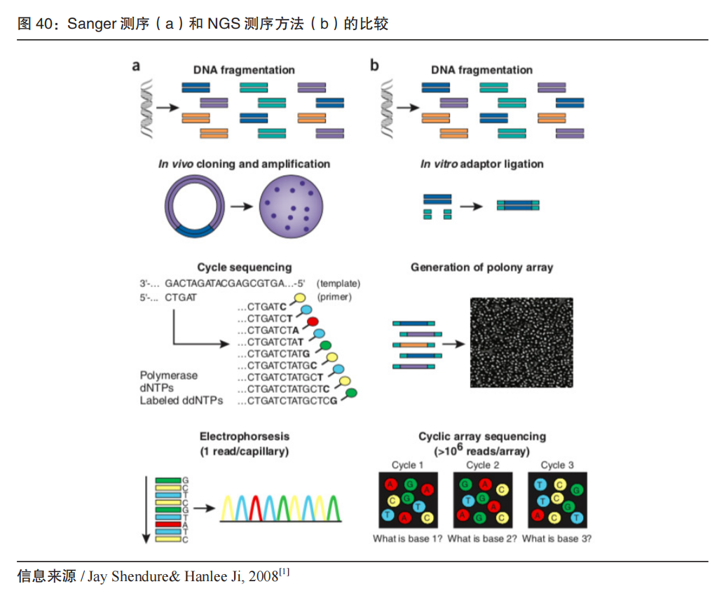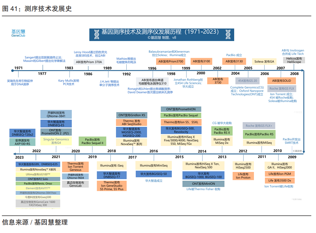 03 基因行业基础技术 基因测序及生产平台 测序技术是目前基因行业的基础技术,极大推动了基因行业的应用。测序本质是检测基因序列信息,也是基因编辑、基因合成过程中的基础技术。 实现检测基因序列功能的技术,还包括基因芯片、荧光定量PCR、数字PCR、光学图谱、核酸质谱等(注:由于测序的通用性以及未来扩展性,此处对此展开重点讨论)。 理解技术原理是评估不同测序系统的基础。这里对不同测序技术原理作简要阐述。 1975年,Sanger测序法在吴瑞先生的引物延伸的基础上实现了“直读”——通过实现DNA复制及合成,直接在凝胶上按顺序直观读出测序模板。具体地,即在DNA链合成过程中加入双脱氧核苷酸(ddNTP),荧光标记的ddNTP和天然碱基(单脱氧核苷酸dNTP)按碱基互补的原则被聚合到新合成的DNA链上;当聚合到ddNTP,DNA 链合成就终止(“双脱氧链末端合成终止法”的由来);荧光信号被成像系统检测并结合凝胶电泳上的位置,即确定待测DNA序列。这也是最传统的边合成边测序技术(Sequencing by Synthesis,SBS)。 1986 年,加州理工学院的Leroy Hood发明了“四色荧光法”,使得传统的SBS走向自动化(ABI测序系统);从454系统开始,引入了可逆终止末端,建立焦磷酸测序,实现高通量测序的NGS,即通过读取dNPT在DNA聚合反应时释放出的焦磷酸,采用乳液PCR来构建文库;Ion Torrent 测序是基于半导体元件,检测测序反应过程中 H+ 浓度变化,因为设计巧妙而体积小,成为第一代桌面型测序仪代表;Illumina 测序是基于可逆终止法,通过 3' 端可逆性的修饰和去修饰实现末端循环合成测序,采用DNA模板分子簇合成DNA突破性地扩大了通量;SOLiD 测序是连接测序法,特别之处是以DNA连接酶取代DNA聚合酶,对每个碱基读两次,理论上提高准确率;华大智造的 DNBSEQ 采用优化的联合探针锚定聚合技术(cPAS)和改进的DNA纳米球(DNB),通过线性扩增降低单拷贝的错误率。 单分子测序是通过单分子的检测装置直接读取碱基,最大特点是无需PCR扩增,减少扩增中的偏号(bias)且提高读长。具有代表性的企业之一是 HeliScope,本质是在SBS加上超敏感的荧光检测装置,相关技术后来被部分公司引入;PacBio的核心是零膜波导孔,每个单元百万级数量的孔上固定DNA链及dNTP,结合时被激光照射发出荧光然后转换成碱基信号;ONT的纳米孔测序是单分子测序的一种,通过单链DNA或RNA通过纳米孔时的电信号实时测序。纳米孔包括物理纳米孔(硅等无机材料)和生物纳米孔(纳米芯片上的蛋白质)。 测序技术经历了近50年的发展,第一台商用测序仪 Prism370A 面世了37年,但真正的大规模商用化仅17年(起点是2008年GAII将WGS降低至10万美元),真正的百美元基因组才刚刚开始(2023年华大智造发布 DNBSEQ-T20x2),真正的普惠时代即将到来;2022年前后,市场上以“舶来”的专利推出数种测序仪新品涌现,需要谨慎评估技术原创性及应用可及性,企业需要重视底层技术研发和产品上市前的验证工作。 目前 454 测序仪(焦磷酸测序法),SOLiD(连接法测序)、HeliScope 均退出了市场。按进入市场的时间顺序,目前市面上主流测序技术及品牌如下: