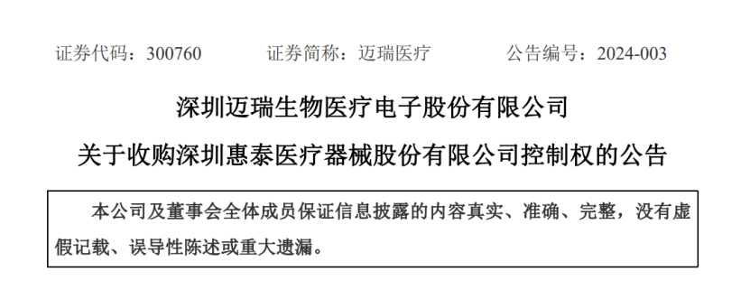 23Q4收入环比加速,研发投入增加明显。23Q4单季度公司实现收入4.37亿元(+32.80%),实现归母净利润1.31亿元(+34.11%),实现扣非归母净利润1.08亿元(+21.78%)。单Q4毛利率70.95%,净利率28.77%。23Q4的销售费用为7168万元(+16.04%),研发费用为6959.89万元(+71.62%)。(1)全年电生理手术量目标顺利完成,新品入院及在研项目进展顺利。2023年,公司在超过800家医院完成三维电生理手术10000余例,手术量较2022年度增长超过200%。公司可调弯十极冠状窦导管在该品类细分市场中维持份额领先,可调弯鞘管通过带量采购项目完成200余家中心的准入。电生理产品线在研项目脉冲消融导管、脉冲消融仪、高密度标测导管、压力射频仪等已进入临床试验阶段。(2)血管介入市场覆盖医院数持续增加,产品持续升级。公司2023年产品入院家数较去年底增长超600家,整体覆盖医院数3600余家,其中外周线入院增长超30%,冠脉线增长接近20%。截至报告期末,在研项目胸主动脉支架、腔静脉滤器、弹簧圈等植入产品进入注册发补阶段,颈动脉支架、TIP覆膜支架进入临床试验阶段。(3)国际市场良好增长,同比实现增长72.62%。其中,中东非洲、独联体区域同比增长超100%,其他区域实现平稳增长。从产品线层面看,PCI自主品牌及EP自主品牌是国际业务增长的驱动源头。报告期内,公司仍专注于核心策略产品的准入与增长。国内电生理产品新增医院植入 300 余家,覆盖医院超过 1100 家。同时,国内电生理业务如期实现从传统二维手术到三维手术的升级,建立了良好的三维产品市场品牌。电生理业务营收 3.68 亿,同比增长25.5%。目前电生理市场的主要外资厂商为强生、雅培、美敦力和波士顿科学,国产厂商为微电生理、心诺普医疗、锦江电子及惠泰医疗,其中微电生理2023年营收3.29亿,同比增长26.46%。报告期内,公司血管介入类产品的覆盖率及入院渗透率进一步提升,产品入院家数较去年底增长超 600 家,整体覆盖医院数 3600 余家,其中外周线入院增长超 30%,冠脉线增长接近 20%。公司自 2008 年开始专注研究血管介入产品,通过多年的探索与积累,生产工艺与装备日趋成熟高效。目前,公司已经建立 18 条血管介入产品线,包括血管鞘组、微导管、 造影导管、导引导管、球囊导管、亲水涂层导丝、导引导丝、微导丝、支撑导管、各类 OEM 产品线等产品系列,较 2022 年产能提升 50%。报告期内公司始终坚持研发及创新,通过持续的高研发投入,不断强化和巩固在介入类医疗器械领域的研发实力,公司近三年研发投入分别为 13487.68 万元、17487.63 万元及 23791.56 万元,占营业收入比重达 16.28%、14.38%及 14.42%。报告期内,公司冠脉、外周产品线持续升级。冠脉产品导引延伸导管、导引导丝、双腔微导管、高压球囊扩张导管等获得注册证;外周产品支撑导管、颈动脉球囊扩张导管、弹簧圈推送导丝、灌注导管等获得注册证。截至报告期末,在研项目胸主动脉支架、腔静脉滤器、弹簧圈等植入产品进入注册发补阶段,颈动脉支架、TIP 覆膜支架进入临床试验阶段。同时,电生理产品线在研项目脉冲消融导管、脉冲消融仪、高密度标测导管、压力射频仪等已进入临床试验阶段。报告期内,公司布局了非血管介入类产品线。截至报告期末,泌尿系统产品线在研项目泌输尿管支架及附件、输尿管扩张球囊导管均进入注册审核阶段;肝胆系统产品线的在研项目一次性取石网篮进入注册审核阶段。未来,公司仍将加大研发投入,不断加速已有产品的技术革新和新产品研发,坚持技术创新,保持公司的技术优势。# 公司大事件2024年1月28日晚间,迈瑞医疗、惠泰医疗同步公告,公告显示:深圳迈瑞生物医疗电子股份有限公司拟通过全资子公司深圳迈瑞科技控股有限责任公司,以协议转让方式收购深圳惠泰医疗器械股份有限公司14,120,310股人民币普通股股份,占标的公司总股本的21.12%,转让金额合计为人民币6,652,419,049.75元。同时,标的公司实际控制人成正辉承诺,在其根据《股份转让协议一》约定收到全部股份转让价款之日起及之后自愿、永久且不可撤销地放弃所持标的公司10%的股份所享有的表决权。惠泰医疗主打电生理、血管介入两大业务板块。作为最早布局国内电生理市场的公司,同时也是最早接轨国外技术水平的行业内企业,惠泰医疗潜力颇受投资人青睐。据弗若斯特沙利文数据,2020年,惠泰医疗就以约 3.1% 的市场份额在国产厂商中位列第一名。整体来看,惠泰医疗近几年的业绩表现颇为亮眼,净利润不断增长。 2021年1月7日,惠泰医疗正式登陆上交所科创板。上市当年,在医疗板块可谓“一只独秀”,年涨幅高达288.94%。此次易主,距离公司上市正好满三年。 过去三年间,因新品上市、集采、并购等带来的销量增长,惠泰医疗营收“三级跳”,轻松迈过十亿关口,从2020年底的4.79亿暴增至2022年12.61亿元,净利润也从七千多万增长至3.4亿。对于收购后的后续计划,交易双方在披露的公告中表示,“迈瑞医疗将以此进入心血管领域相关赛道,利用其在医疗器械领域的积累和人才储备,助力惠泰医疗提升研发能力;并将结合全球营销资源覆盖优势,推动惠泰医疗电生理及相关耗材等心血管业务的发展;同时,为未来横向业务拓展奠定基础,提升惠泰医疗的综合业务竞争力,推动中国医疗健康产业的发展。”据弗若斯特沙利文数据,国内电生理器械市场规模由2015年14.8亿元增长至2020年的51.