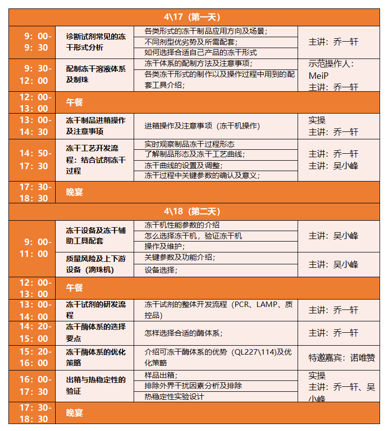 🌸 活动预告:让我们共同期待春意盎然的四月,相聚在简逸生物举办的冻干试剂开发实操培训班,无论是初涉冻干领域的探索者,还是亟待优化产品方案的资深开发者,都将在这里收获满满的知识与实践经验。简逸生物承诺,让您满载而归,不虚此行! 🌿 课程安排 培训费用:4999元 培训地点:上海嘉定区兴贤路1180号育成生物园7幢3楼 主办单位:上海简逸生物科技有限公司 培训福利: 每位学员获得:实操生产出来的冻干球:200~500颗(PCR冻干试剂Mix) 原料赞助:诺唯赞 ※食宿自理 扫码联系报名