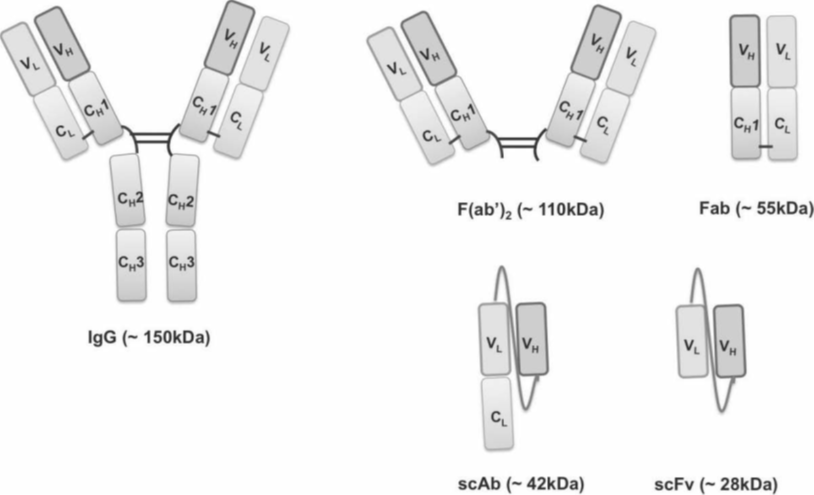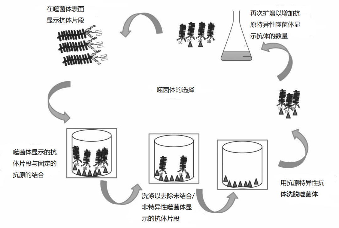 免疫测定是利用免疫球蛋白(Ig)(抗体)作为高灵敏度的粘合剂来检测存在于低浓度的分子的生化试验。抗体是体液免疫系统的一个组成部分,是自然界的主要识别装置。它们存在于B细胞(B-淋巴细胞)的表面,识别外来抗原的存在。B细胞可以检测并发出信号,表明存在广泛的抗原,包括从朊病毒到病毒、药物、毒素和入侵我们身体的异常生物大分子的分子。免疫球蛋白以许多不同的形式存在,免疫球蛋白的五个主要同型是IgG(如图1.1所示)、IgM、IgD、IgA和IgE。IgG由两条重链(由恒定结构域CH1、CH2和CH3以及可变重结构域VH组成)和两条轻链(由恒定轻结构域CL和可变轻结构域VL组成)组成,通过二硫键连接。抗原结合区由一条可变重链和一条可变轻链组成,它能识别抗原的表位(发生结合的特定区域)。抗体因其天然的高亲和力和出色的半衰期而处于靶向治疗和诊断的最前沿。它们可以很容易地用标准的分子生物学技术操作成定制的抗体,在其选择的终端应用中有效地执行。生物制药行业在基于抗体的诊断和治疗方面进行了大量投资,而后者目前代表了最大和增长最快的生物制药类别[1, 2]。(i)多克隆(由各种B细胞克隆的混合物产生),(ii)单克隆(由单个B细胞克隆分泌)和(iii)重组抗体(抗体基因的遗传操作的产物)[3, 4]。多克隆抗体的生产包括用抗原和佐剂(免疫系统刺激材料)的混合物对动物进行免疫,从而激活多个针对不同抗原表位的B细胞。这产生了大量的具有不同特异性和表位亲和力的抗体[3]。多克隆抗血清可以相对快速地获得(对于高免疫原性的抗原,6-12周),但时间可能取决于抗原。这些方法在表1.1中列出[5],并在第12章中详细讨论。生产多克隆抗体需要考虑几个关键步骤,包括(i)抗原的制备/可用性,(ii)宿主物种的选择,(iii)注射制度,(iv)监测抗体对免疫原的反应以及(v)抗体的收集/纯化。在开发针对人类目标的多克隆抗体时,宿主的选择特别重要,因为大量的蛋白质在整个哺乳动物进化过程中是高度保守的,因此,在许多哺乳动物物种中是共同的。因此,将这些蛋白质免疫到兔子和小鼠身上,可能会产生有限的免疫反应[6]。使用在系统发育上与人类相距较远的物种,如鸡(约3.1亿年前从哺乳动物基因组中分化出来[7]),是对高度保守的人类蛋白进行免疫和选择抗体的理想选择[6,8]。「杂交瘤技术」的发展为Georges K¨ ohler和C´esar Milstein赢得了1984年的诺贝尔生理学或医学奖。他们创造了一种不死的细胞系,能够产生无穷无尽的具有已知特异性的相同的抗体,称为「单克隆抗体」,标志着它们来自一个单一的混合细胞[9]。来自免疫小鼠的B细胞被分离出来,并与骨髓瘤细胞系融合,形成杂交瘤(通常通过添加聚乙二醇(PEG)的方式)。特定杂交瘤的克隆和选择是通过「限制性稀释」进行的。克隆被筛选出反应性,产生特定抗体的克隆被进一步定性和扩增以产生所需的抗体。重组抗体对于定制化的抗体开发是非常有吸引力的,因为可以很容易地采用遗传操作来精确定制其特异性和生物物理特性[10-14]。在大肠杆菌中容易产生大量的重组蛋白,而且生产成本低,这促进了各种不同的抗体构建体的出现,它们可以被用于广泛的应用。哺乳动物IgG构建体(150 kDa)由两条重肽链和两条轻肽链组成,通过二硫键连接在一起。重链由可变重区(VH)和三个恒定区(CH1,CH2,和CH3)组成。scFv由VH和VL链通过一个柔性连接体连接在一起组成。单链抗体(scAb)片段由一个scFv和一个额外的恒定链(重链或轻链)组成。Fab(抗原结合片段)包含完整的轻链与VH和CH1。F(ab')2是由两个Fab片段组成,通过二硫键结合在一起。保留人IgG全部单价抗原结合能力的最小的抗体片段是可变片段(Fv),它由可变重域(VH)和可变轻域(VL)组成,通过非共价相互作用结合在一起[12, 13]。单链可变片段(scFv)比Fv更稳定(Fv比scFv更容易聚集),通常,一个灵活的15个残基的甘氨酸/丝氨酸((Gly4Ser)3)连接物被加入,将链连接在一起,在细菌表达过程中帮助抗体折叠和稳定[14]。抗原结合片段(Fab)是一个更大、更稳定的片段,约50kDa。Fab片段由可变重链、可变轻链、恒定重链和恒定轻链(VH和CH1以及VL和CL)组成。在CH1和CL之间存在一个链间二硫键(图1.3)[15]。可以设计的不同类型的重组抗体结构有各种优势和劣势。还应注意的是,抗体片段可以相对容易地重新方法学化,以改善其特性,如表达[16],减少非特异性结合[17]和增强特异性[18]。超级抗原特异性重组片段的选择可以通过一个被称为噬菌体展示技术的过程来实现。当George P. Smith在1985年首次证明在丝状噬菌体中可以建立表型和基因型之间的联系时,噬菌体展示技术出现了[19]。在过去的几十年里,对抗体结构和功能的进一步了解使得噬菌体展示成为控制选择独特抗体的最有力的工具之一,这些抗体具有传统杂交瘤方法无法达到的特性[20, 21]。噬菌体展示法可用于原始、免疫或合成剧目[22],并允许从高度多样化的抗体片段组合库中对确定的抗原构象进行控制性选择和筛选抗体[23]。筛选包括让噬菌体库连续接触抗原,让抗原特异性的噬菌体显示的抗体与它们的目标结合,这个过程被称为「淘金」。抗原特异性的噬菌体被回收,随后被感染到细菌中进行再扩增[21]。然而,噬菌体的非特异性结合限制了每一轮中可以实现的富集。因此,有必要进行2-5轮的淘洗,以确定高亲和力的结合物[23]。「淘洗」的过程是通过噬菌体库与目标结