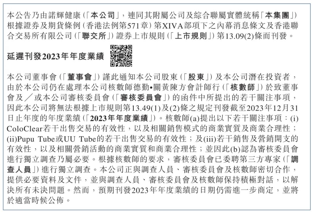 上市公告圈热闹非凡。 燃石如期发布了2023Q4和全年的业绩,大家耐心点,我们应该今天可以给出详细的解读。 粗略看下来虽然有点惨,但是符合我们的预期。 最关键的,人家审计没啥问题直接放行了。 所谓如期发布,结果也如预期。 呃。。。我没有内涵谁。 诺辉的公告就有点让人耐人寻味了,德勤给出的公告延期公告显得有点让人心惊肉跳。 1)可能否定ColoClear常卫清的销售量,潜台词大家都懂; 2)Pupu Tube噗噗管/UU Tube幽幽管的销售量亦存在问题,潜台词大家也懂; 3)商业模式直接否定,即认为给出的销售渠道解释并不能让审计师信服。 4)需要独立调查。 好,这个公告基本上要无限期延长了。 无期啊...
