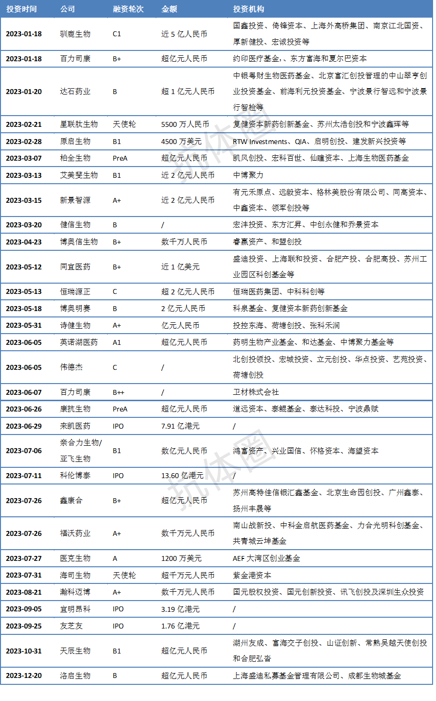 在中国,生物医药行业已经成为了风险投资机构的重点关注对象,风险投资对生物医药行业的资金投入不断上涨,已成为推动我国生物医药行业发展的重要力量。 对于生物医药企业,吸收风险投资不仅能缓解企业遭遇的资金难题,更能借助风投机构的经验,改善企业治理结构,提高企业经营效率,促进企业经营绩效增长。抗体药物是现代生物医药行业中占比最大、增长最快的子行业,接下来我们看一下2023年一整年抗体药企业的投融资情况。 达石药业完成超1亿元的B轮融资,达石药业的本轮融资由广东粤财控股旗下的中银粤财生物医药基金领投,跟投方包括北京富汇创投管理的中山翠亨创业投资基金、前海利元投资基金、宁波景行智远和宁波景行智检等私募基金。现有股东凯泰资本和中山香商投资继续加持。所筹资金将用于推进达石药业的临床研发、产品管线拓展、人才团队建设及其它公司运营需求。达石药业成立于2017年8月,是一家专注于疼痛和肿瘤并发症治疗的创新型抗体药物研发企业。百力司康生物医药(杭州)有限公司宣布已完成逾亿元人民币B+轮融资。本轮融资由约印医疗基金领投,现有股东东方富海和夏尔巴资本持续加注。本轮融资将用于BB-1701、BB-1705、BB-1709项目的临床研究推进、产品管线其它品种的临床前研究及注册申报、为创新药项目上市申请做准备等。BB-1701为一款HER2抗体偶联物(ADC),目前正在推进II期临床队列扩展研究;公司第二款创新药BB-1705为EGFR ADC,与BB-1701一样拥有相同的独特的上市药毒素艾立布林(Eribulin),正在进行I期临床研究;公司第三款创新药BB-1709为First-in-Class ADC,已获美国FDA批准进行临床研究,中国NMPA的IND申报已受理。百力司康生物于2017年12月在浙江省杭州市钱塘区成立,拥有自主知识产权的生物医药研发型临床阶段的国家高新技术企业,专注于抗肿瘤生物创新药的研发和产业化。公司目前有三款肿瘤靶向创新ADC在临床研究阶段,均具有多种肿瘤适应症的广阔市场前景。驯鹿生物宣布完成近5亿元人民币C1轮融资。此轮融资由国鑫投资、倚锋资本、上海外高桥集团、南京江北国资、厚新健投、宏诚投资等11家投资机构共同参与。本轮募得资金主要用于公司产品管线的研发和临床推进以及核心产品伊基仑赛注射液的商业化运营。驯鹿生物是一家处于临床阶段、致力于细胞创新药物开发。驯鹿生物现有10个在研品种处于不同研发阶段,其中进展最为迅速的候选产品伊基仑赛注射液上市申请(NDA)获国家药监局(NMPA)正式受理并纳入优先审评资格,用于治疗复发/难治性多发性骨髓瘤,该产品曾先后被NMPA纳入“突破性治疗药物”品种及被FDA授予“孤儿药(ODD)”认定。除多发性骨髓瘤外,伊基仑赛注射液新增扩展适应症-抗体介导的视神经脊髓炎谱系疾病的临床试验申请(IND)已获NMPA批准;此外,公司自主研发的创新候选产品CT120(全人源CD19/CD22双靶点CAR-T细胞注射液)已进入临床研究阶段,适应症分别为CD19/CD22阳性的复发/难治性B细胞非霍奇金淋巴瘤(B-NHL)和复发/难治性急性B淋巴细胞白血病(B-ALL),并已获得FDA授予孤儿药认定。原启生物科技(上海)有限责任公司宣布,继在2022年7月完成1.25亿美元B轮融资后,近日完成了4500万美元的B1轮融资,将主要用于支持其核心产品在国际市场的临床开发。本轮融资由全球知名产业投资者RTW Investments与QIA(Qatar Investment Authority卡塔尔投资局)联合领投,现有股东启明创投、建发新兴投资等继续投资。原启生物成立于2015年,斥资构建了协同增效的创新型产品研发技术平台,聚焦全球肝癌、卵巢癌、胃癌、宫颈癌、非小细胞肺癌等未被满足的临床治疗需求,开发创新型、有临床价值的细胞药物和双抗是原启生物的长期发展战略。目前,美国食品药品监督管理局(FDA)正式批准原启生物的OriCAR-017用于治疗复发/难治性多发性骨髓瘤(R/R MM)患者的新药临床申请(IND)。天津星联肽生物科技有限公司宣布完成5500万人民币天使轮融资。本轮融资由复星医药旗下复健资本新药创新基金领投,种子轮创始股东继续跟投,苏州太浩创投和宁波鑫珲等新晋股东共同参与,融资资金主要用于两个多肽偶联药物(PDC)产品的开发、新药临床研究申请(IND)和早研平台的搭建。星联肽成立于2022年,主要聚焦于蛋白偶联药物研发平台。目前已有三个产品处于临床前开发阶段。其中,靶向Nectin-4的PDC产品SC-101预计下半年提交IND,2024年进入1期临床研究。上海健信生物医药科技有限公司完成B轮融资,本轮融资由宏沣投资领投东方汇昇,中创永健和老股东乔景资本跟投。本轮融资将加速公司自主研发的两款首创双抗产品Bis2和Bis5 的I期临床研究,强化PD-1后时代肿瘤治疗细分领域公司首创产品的技术壁垒,同时推动首创三抗产品的临床前研究。健信生物成立于2015年10月,聚焦肿瘤免疫治疗方向,专注双/多特异抗体新药研发、开发针对PD-1抗体治疗无效、耐药的细分病人 First-in-Class (FIC) 的产品。其核心产品Bis5和Bis2均获得中、美临床批件,现正在开展I期临床研究;多款首创三抗处于临床前开发阶段,2款自主研发产品授权上市公司共同开发。新景智源生物科技(苏州)有限公司完成近2亿元A+轮融资。本轮融资的投资方有元禾原点、远毅资本、格林美股份有限公司、同高资本、中鑫资本、领军创投等知名医疗健康专业基金,老股东泰福资本持续追加投资,浩悦资