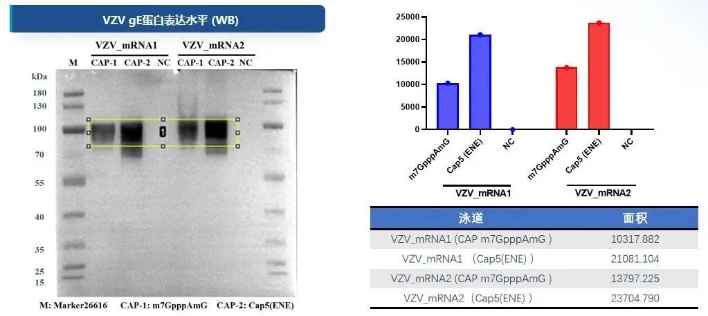 VZV_mRNA1和VZV_mRNA2 LNP制剂10μg分别转染HEK293T细胞,转染后48hr对靶蛋白gE进行特异性抗体(ab272686)WB表达验证;结果表明,Cap5(ENE) VZV mRNA疫苗gE蛋白表达水平显著高于CAP m7GpppAmG VZV mRNA疫苗,总体蛋白表达率为m7GpppAmG的2.04倍和1.72倍。