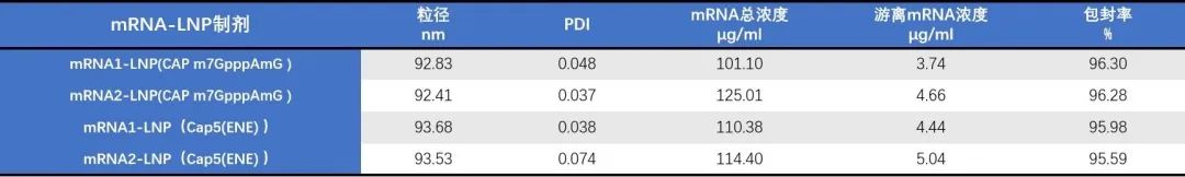 Table 2. Cap5(ENE) vs. CAP m7GpppAmG mRNA-LNP制剂 总体制备粒径90~100nm;PDI≤0.08,包封率≥95%