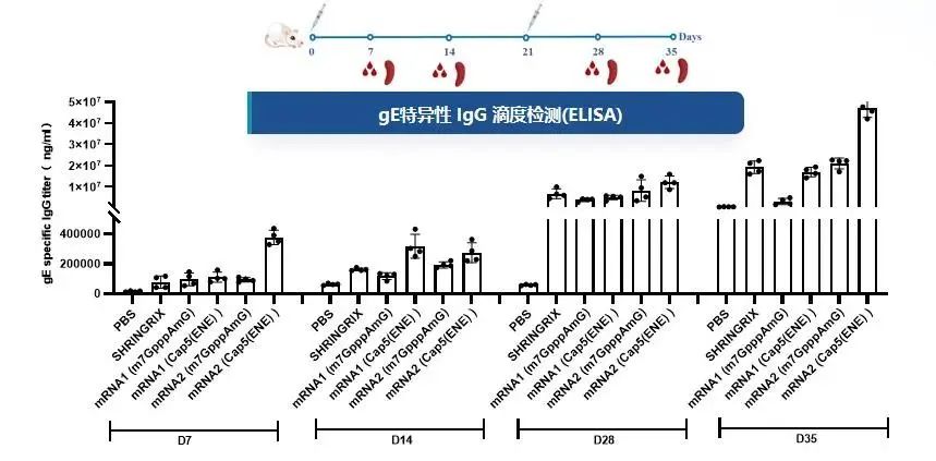 申基与VZV疫苗项目的合作者一起设计开发mRNA疫苗。抗原选择—序列设计—体外转录—mRNA-LNP制备—动物实验,经过一步步实验验证,设计的VZV_mRNA1和VZV_mRNA2带状疱疹mRNA疫苗在小鼠身上表现出了非常强的免疫效果。另外,在合成VZV_mRNA1和VZV_mRNA2时,特使用了申基自主知识产权的新帽类似物Cap5(ENE)和传统的m7GpppAmG,以评估Cap5(ENE)的实验效果。