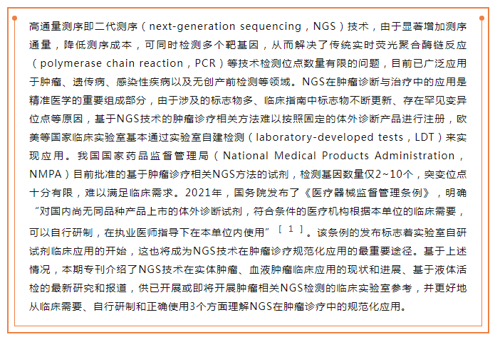 高通量测序即二代测序(next-generation sequencing,NGS)技术,由于显著增加测序通量,降低测序成本,可同时检测多个靶基因,从而解决了传统实时荧光聚合酶链反应(polymerase chain reaction,PCR)等技术检测位点数量有限的问题,目前已广泛应用于肿瘤、遗传病、感染性疾病以及无创产前检测等领域。NGS在肿瘤诊断与治疗中的应用是精准医学的重要组成部分,由于涉及的标志物多、临床指南中标志物不断更新、存在罕见变异位点等原因,基于NGS技术的肿瘤诊疗相关方法难以按照固定的体外诊断产品进行注册,欧美等国家临床实验室基本通过实验室自建检测(laboratory-developed tests,LDT)来实现应用。我国国家药品监督管理局(National Medical Products Administration,NMPA)目前批准的基于肿瘤诊疗相关NGS方法的试剂,检测基因数量仅2~10个,突变位点十分有限,难以满足临床需求。2021年,国务院发布了《医疗器械监督管理条例》,明确“对国内尚无同品种产品上市的体外诊断试剂,符合条件的医疗机构根据本单位的临床需要,可以自行研制,在执业医师指导下在本单位内使用”。该条例的发布标志着实验室自研试剂临床应用的开始,这也将成为NGS技术在肿瘤诊疗规范化应用的最重要途径。基于上述情况,本期专刊介绍了NGS技术在实体肿瘤、血液肿瘤临床应用的现状和进展、基于液体活检的最新研究和报道,供已开展或即将开展肿瘤相关NGS检测的临床实验室参考,并更好地从临床需要、自行研制和正确使用3个方面理解NGS在肿瘤诊疗中的规范化应用。