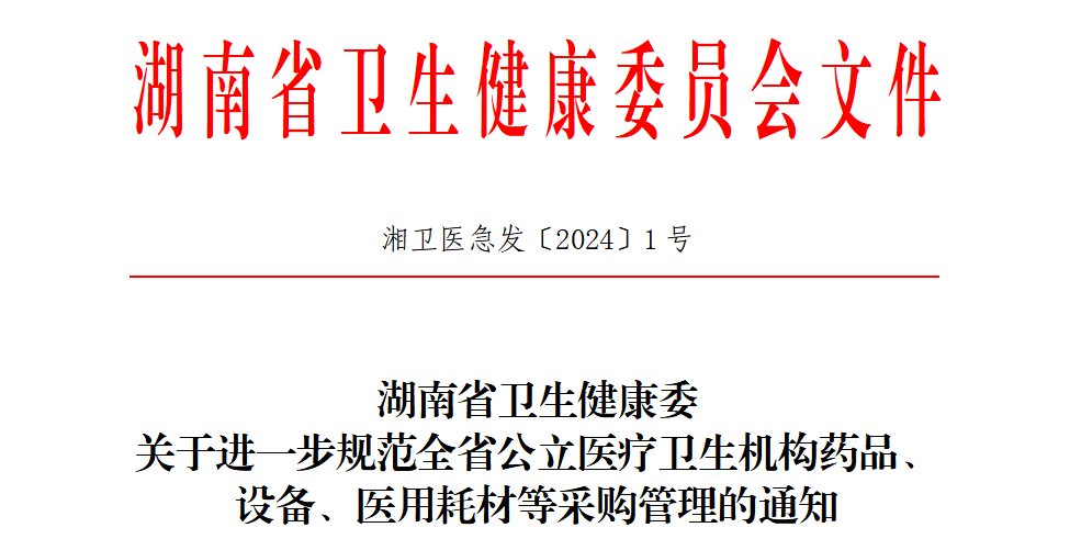 4月8日,湖南省卫健委发布通知,关于进一步规范全省公立医疗卫生机构药品、设备、医用耗材等采购管理的通知。要求自2024年5月3日起施行,有效期5年。 各市州卫生健康委,省中医药局、省疾控局,委直属和联系医疗卫生机构:为进一步规范医疗卫生机构药品、设备、医用耗材等采购管理,根据相关法律法规及政策要求,结合工作实际,我委制定了《关于进一步规范公立医疗卫生机构药品采购管理的指导意见》《关于进一步规范公立医疗卫生机构设备采购管理的指导意见》及《关于进一步规范公立医疗卫生机构医用耗材采购管理的指导意见》,现印发给你们。各地各单位要结合实际制定具体实施办法,切实抓好落实。关于进一步规范公立医疗卫生机构医用耗材采购管理的指导意见为进一步规范医疗卫生机构医用耗材申报、计划、购置、验收、配送、使用等各环节的管理,保障患者使用器械的安全和医疗工作正常有序的开展,根据《医疗器械监督管理条例》《湖南省药品和医疗器械流通监督管理条例》《医疗机构医用耗材管理办法(试行)》(国卫医发〔2019〕43号)等法律法规及相关政策要求,结合工作实际,制定本指导意见。(一)按照《医疗机构医用耗材管理办法(试行)》有关规定,二级以上医疗机构应当成立医用耗材管理委员会,其他医疗机构应当成立与其规模相匹配的医用耗材管理组织。医用耗材管理委员会由具有高级技术职务任职资格的相关临床科室、药学、医学工程、护理、医技科室人员以及医院感染管理、医用耗材管理、医务管理、财务管理、医保管理、信息管理、纪检监察、审计等部门负责人组成;医用耗材管理组织可参照医用耗材管理委员会根据医疗机构实际来组成。医疗机构负责人任医用耗材管理委员会(组织)主任委员,医用耗材管理部门和医务管理部门负责人任医用耗材管理委员会(组织)副主任委员。日常工作由医用耗材管理部门和医务管理部门分工负责。(二)建立健全医用耗材管理制度、操作规程和工作记录,并组织实施。(三)建立医用耗材遴选与采购管理制度。根据集中带量采购中选结果、遴选结果建立医用耗材供应目录,除集采中选产品外,对具有相同或相似功能的临床必需产品,同一规格可准入一定数量的备选产品以保证临床供应。医用耗材供应目录应根据遴选和使用等情况动态管理、定期调整。不得在医用耗材遴选、采购和使用中牟取不正当利益。(四)对新申请准入的医用耗材,应当按各医疗机构内控制度的要求,由使用科室组织不少于3名中级职称及以上、熟悉业务、具备专业能力的专家对拟提交的医用耗材准入申请进行科内论证和集体决策,论证和决策过程全员签字存档,科室相关人数不够的应从其他科室协调人员参与。医用耗材管理委员会(组织)须针对医用耗材采购的科学性、必要性、可行性等,组织开展必要的评估论证,委员会(组织)须随机抽取三分之二以上人员参与,经参与评估论证的一半以上委员同意,按规定流程审定后纳入医用耗材遴选目录。(五)按照采购岗位不相容原则,技术参数由医用耗材管理部门和使用科室共同确定,经集体决策,形成功能要求、技术参数、预估年使用量等组成的耗材遴选清单。优先选用带量集采中选和政府集中采购入围目录医用耗材。(六)按照国家相关标准、行业标准、地方标准等要求制定遴选文件。严禁设置倾向性、排他性参数和指标,严禁设置不合理和歧视性条件。(七)获得国家医保医用耗材分类及代码,面对患者单独收费的医用耗材(含体外诊断试剂),不再纳入政府采购,应当在省医保信息平台药品和耗材招采管理子系统、省医药采购平台(简称“省招采系统”、“省采购平台”)上实行阳光采购,按照医用耗材遴选与采购管理制度执行,严禁网外采购。医用耗材品牌、配送供应商、采购价格等通过遴选确定,并签订采购合同。(八)应当充分考虑设备配套使用的医用耗材成本,作为采购设备的重要参考因素。(九)制定完善医用耗材临时采购内控制度。因特殊病种、新技术新项目及医学科研所需指定医用耗材,但医用耗材供应目录不能满足需求且无类似可替代的耗材,可进行临时采购,仅限单次使用。至少每半年对使用情况进行分析评价和公示。(十)因紧急医学救援、突发公共卫生事件等紧急情况,可不受供应目录的限制进行采购,依据医疗卫生机构内控制度做好相关记录并备案。(十一)建立并完善医用耗材入库验收、保管、盘存、报废等管理制度。配备专职验收人员按供货目录清单和有关质量要求进行验收。(十二)医用耗材管理部门根据使用科室提出的临床需求申请,按照规定进行审核和发放,确保医用耗材的安全和质量。(十三)根据医疗废物相关管理规定,加强使用后医用耗材的处置管理。(十四)对医用耗材实行台账清单管理,逐步建立和完善信息化管理制度和系统,力争实现使用可溯源。(十五)开展医用耗材临床使用评价,评价结果应当作为医疗卫生机构动态调整医用耗材供应目录的依据,对存在不合理使用、出现超常预警的品种,可以采取停用、重新招标等干预措施。(十六)落实医疗器械使用不良事件报告制度,做好医用耗材不良事件监测和评价工作,定期公示,及时上报。(十七)发挥纪检监督、内部审计等监督作用,加强对医用耗材采购全过程的管理和监督,对重点环节实行
